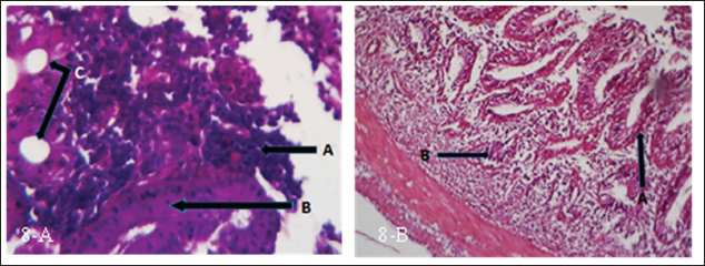 Fig. 8. (a) Histopathological section of intestine of common carp showing inflammatory cells infiltration (A), thickening in lamina properia (B) and vacuolation (C). H&E ×10.; (b) Histopathological section of intestine of common carp showing shortening in lamina properia (A) and inflammatory cells infiltration (B). H&E ×10.