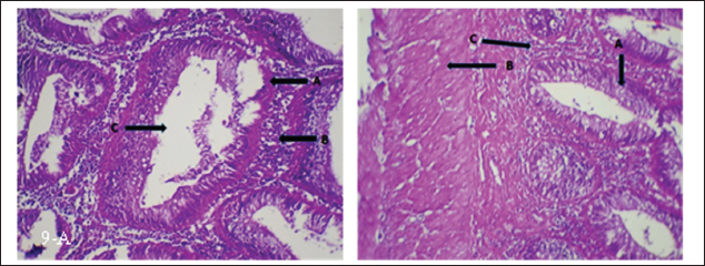 Fig. 9. (a) Histopathological section of intestine of common carp showing hyperplasia of intestinal gland (A), inflammatory cells infiltration (B) and complete vacuolation (C). H&E ×20.; (b) Histopathological section of intestine of common carp showing enlargement of intestinal gland (A) and thicked of muscular layer (B) and inflammatory cells infiltration (C). H&E ×20. Gill: