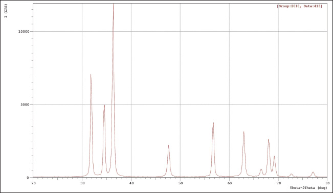 Fig. 2. XRD patterns of ZnO NPs. X-ray diffractionThe average particle size (PS) and phase detection of particles were evaluated by X-ray diffractions (XRDs) pattern using X’pert Pro diffract meter (Shemadzu, Japan) that was used to affirm the crystal phases and size, in the University of Technology, Nanotechnology. It was carried out using X-ray diffractometer with Cu- Kα crystal radiation (λ=1.541 A°) scanning at a speed of (10º deg/min) for (2 theta) range of 20º–80º. The diffraction peaks were identified by comparison with (00-036-1451) card/Variable Slit Intensity. The full widths at half maximum in the XRD was used to determine the crystallite size by Scherer’s equation. The strain values η, and the values of dislocation densities δ, were calculated by (Zak et al., 2012). XRD pattern of ZnO NPs is shown in (Fig. 2), based on the XRD pattern. The pattern shows that all the diffraction peaks are indexed to the hexagonal phase of pure ZnO NPs, ZnO NPs diffraction peaks appearing at scattering angles (2θ)=31.88°, 34.52°, 36.39°, 47.64°, 56.70°, 62.95, 66.48, 68.03, 69.16, and 77.05. The strongest three peaks in 36.39, 31.88, and 34.52, respectively. Particle sizePS was determined according to the method as described by (Shamhari et al., 2018), by used Brookhaven instruments Corp. (90Plus Particle Sizing Software Ve 5.34), laser in the University of Technology, Nanotechnology. Diluted suspensions are prepared, in the range of 0.0001%–1.0% v/v, using appropriate moisturizing and/or dispersing agents, if necessary. A small ultrasound is sometimes helpful in breaking up loose clumps. Small sample volumes are used as 50 µl. The sample is refundable. U-shaped, disposable, polystyrene cells are used to suspend aqueous and ethanol solutions. It takes a few minutes for the sample and the cell to balance with the effectively controlled temperature environment inside Nano Brook (Iso, 2009). PS also performed to further confirm the size of ZnO NPs was shown in (Fig. 3), and the mean diameter was 36.5 nm. Treatment by ZnO NPsThree groups of five male lambs each were randomly selected. As the control group, group I received only glycerol and water as treatment. Group III received oral treatment with 7 mg/kg ZnO NPs once daily for 90 days, while group II received oral treatment with 3.5 mg/kg ZnO NPs. According to (Al-Zubaedi et al., 2020), equal amounts of water and glycerol were combined, and then ZnO NPs were included to the mixture (as a stabilizing agent for ZnO NPs at room temperature). Each treatment group’s appropriate concentration was determined from the prepared mixture. Only a solution of water and glycerol was administered to the control group. Each animal’s dosage was then determined based on its weight, group, and dose. After that, the animals received oral treatment once a day using a disposable syringe.