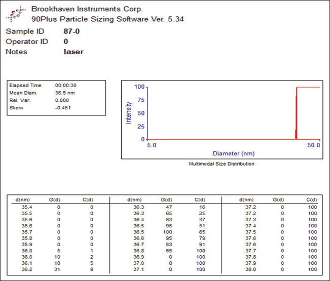 Fig. 3. PS of ZnO NPs, average diameter 36.5 nm. The amount of zinc in lambs feed and administration dosesTable 2 illustrates the amount of zinc in lambs feed compared with the administration doses. Blood samplingBlood samples (5 ml) were drawn from the jugular vein and allowed to gently flow along the inside of a sterile, desiccated tube, as described by (Hameed and Al-Ezzy, 2019). After that, the samples were allowed to clot at room temperature in a slanting orientation for as long as one typical Earth revolution on its own axis. Following that, the samples underwent a 5-minute centrifugation process at a rate of 3,000 revolutions per minute. An automatic pipette was then used to extract the clear sera, which were then placed into previously labeled Eppendorf tubes. After that, the tubes were kept at −20°C until they were examined (Hameed and Al-Ezzy, 2024). Table 2. The amount of zinc in lambs feed and administrative doses.