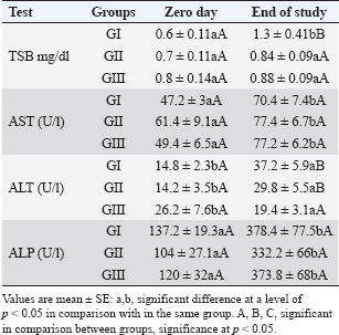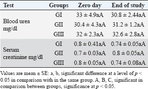 Statistical analysisAll data were denoted as means ± SE. One-ANOVA in SPSS was used for analysis (Hameed et al., 2020). Different letters were used to indicate significant differences at (p < 0.05) (Hussein et al., 2025). ResultsThe results did not show any abnormal clinical signs on the treated animals compared to the control animals, and all the clinical vital signs of the animals were normal. As shown in Table 3, the results of liver function in current study refer to that TSB significant increase in control group (I) at end of study in comparison with zero day, while, in treated groups (II, III) no significant changes at end of study in comparison with zero day, all so, in the between groups significant increase in group I incorporation with group II and III at end of study. The serum values of AST and ALP significantly increased in groups I, II, and III at the end of the study in comparison with zero day, but no significant changes between groups. The serum values of ALP showed significant decreased at end of study in comparison with zero day, While, between groups a significant increase in group I and II incorporation with group III at end of study. The results of serum value for BU showed no significant changes at end of study in comparison with zero day in all groups. The value of serum creatinine showed no significant changes at end of study in comparison with zero day (Table 3). The results of serum value for BU showed no significant changes at end of study in comparison with zero day in all groups. The value of serum creatinine showed no significant changes at the end of the study in comparison with zero day (Table 4). Table 4. Show kidney function parameters of control and treated groups.
