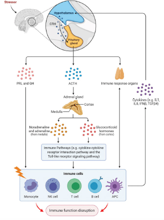 Fig. 3. The function of L-theanine in immunity. Exposure to heat stress increased the expression of the messenger RNA HSP70 in peripheral blood mononuclear cells (Shilja et al., 2016), testis (Niyas et al., 2017), liver, and adrenal gland (Shaji et al., 2017), which may contribute to the reduction of cell resilience capacity, membrane permeability, and immunity. Additionally, they aid in the promotion of anti-inflammatory cytokines and the inhibition of proinflammatory cytokines, enhancing immunity. IL-1, IL-10, IL-12, Tumor Necrosis Factor α (TNF-α), type I interferons (IFN-α and IFN-β), and IFN-γ all play a critical role in the innate immune system. Similarly, IL-2, IL-4, IL-5, TGF-β, and IFN-γ all function in the adaptive immune system (Bagath and Sejian, 2018). According to Staley et al. (2018), immunoglobulin A, specifically secretory IgA or SIgA, is at the forefront due to its critical function in mucosal immunity and its ties to stress, physical health, and general well-being. Short-term SIgA oscillations are difficult to understand, but long-term SIgA patterns are consistent: prolonged stress causes SIgA suppression. According to Jarillo-Luna et al. (2007), stress affects SIgA levels via glucocorticoid signaling, which indicates hypothalamic–pituitary–adrenal axis activity, as well as catecholamine release in response to activation of the sympathetic–adrenal–medullary axis. By attaching to glucocorticoid or 2-adrenergic receptors on B cells or mucosal epithelial cell receptors, these hormone molecules can affect IgA synthesis and/or secretion. In addition, the effect of stress-related internal factors on the immune response was previously recorded in the study of Abo-Al-Ela et al. (2021), which is shown in Figure 4. The changes in these factors are caused by stressors. Immune responseThe application of L-theanine to production aspects is one of a good way to improve poultry immunity. Sosnówka-Czajka and Skomorucha (2018) stated that adding immunostimulants to animal feed or water increases the organism’s immune health. As a therapeutic additive in the diet, L-theanine is usually used to enhance immunity because of its function in immune regulation. L-theanine affects immune and health performance in two ways: first, by raising the relative abundance of beneficial gut microbiota, which in turn reduces pathogenic burden via competitive exclusion. Simultaneously, L-theanine directly inhibits the mRNA expression of toll-like receptors (TLR-2 and TLR-4) and inflammatory cytokines such as TNF-α, IFN-γ, and IL-2 (Saeed et al., 2019). The function of improving immunity is shown in the increase in immune organs weight and the regulation of immune serum levels. There have been some studies regarding the biological function of L-theanine through immune function (Table 1). In broilers, 200 g/kg L-theanine supplementation dramatically lowered the relative serum levels of the proinflammatory cytokines INF-γ and IL-2. Similarly, L-theanine decreased TNF-α and IL-6 mRNA expression in the thymus and mRNA expression of IFN-γ and IL-2 in the spleen. Suppression of L-theanine of these cytokines promotes immunological homeostasis and inhibits further activation of inflammatory responses (Saeed et al., 2018). According to Li et al. (2016), by modulating spleen phospholipase C-1 expression, increasing 5-hydroxytryptamine and dopamine levels in the brain, decreasing serum corticosterone levels, and increasing 5-hydroxytryptamine and dopamine levels in the brain, L-theanine controls the immunological response.