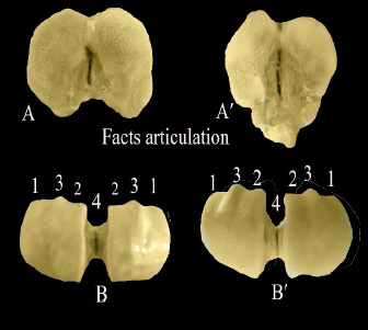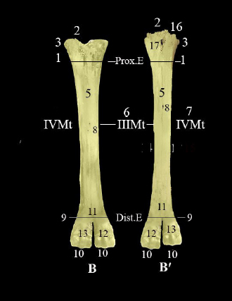 Fig. 5. (A) Proximal extremity of metacarpus showing facet for articulates with second, third and fourth carpal bones. (Aʹ) Proximal extremity of metatarsus, showing facet for articulates first bone and second, third fused and fourth tarsus bones. (B) Distal extremity of metacarpus, (Bʹ) metatarsus showing (1) abaxial articular area, (2) axial articular area, (3) inter-condyloid ridge, and (4) inter-condyloid for articulates with first phalanx.
