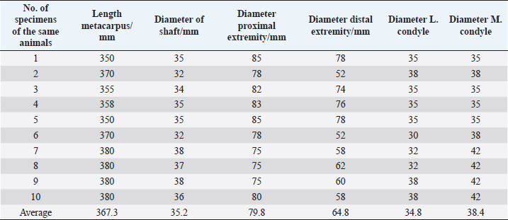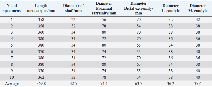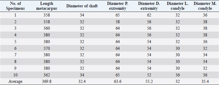 The one-humped camels’ metacarpus-metatarsus were supplied by two nutrients arteries from common palmar-planter digital artery, which is a direct continuation of the median artery. The nutrient artery enters through two nutrient foramens proximal and distal nutrient arteries at the middle part of the bones where they lead into a nutrient canal. This canal extends into the bone body where it gives inside the bone metaphyseal artery to the shaft of the bone, and the epiphyseal artery to supply the spongy bones of the proximal and distal parts of the bones. DiscussionThe anatomical and physiological features of the camel adapt to extreme climatic desert environments (Al Juboori et al., 2010). It is necessary to understand the anatomy of the metacarpus and metatarsus in camels to recognize occurrences of lameness. This could be caused to anatomical flaws (Al-Ani, 2004; Gahlot, 2007). In the present study, the metacarpal and metatarsal bone was four in number, two large III and V which were quadrilateral in form, compressed from side to side, and two small fused metacarpal and metatarsal II and V which were in accordance to Smuts and Bezuidenhout (1987) and Al-Redah and Hussin (2016) in camel, Raghavan (1964) and Budras and Habel (2011) in ox, Yadav et al. (2015) in Indian spotted deer and Choudhary (2015) in blackbuck deer. In contrast to horse, Getty (1975) and Budras et al. (2013) who revealed that the metacarpal and metatarsal bones were three in number, one large III and two smalls were II and IV. The present study revealed that the metacarpus in camels consisted of the fusion of the Mc. III and IV, Fusion of two bones which extended along the whole length except at the distal end where they diverge forming V shape, this was in agreement with the report of Smuts and Bezuidenhout (1987) on camel. Table 3. Morphometric metacarpus of camel female.