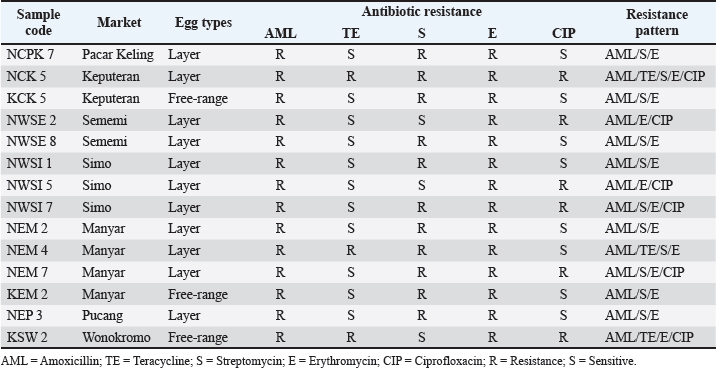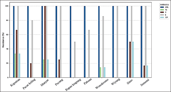 The highest isolation and identification results of K. pneumoniae bacteria were obtained from Wonokromo Market at a percentage of 43.75% (7/16). Furthermore, the Sememi market showed positive results of 37.50% (6/16), and Pacar Keling showed a percentage of 31.25% (5/16). Manyar, Pucang, and Simo markets showed 25.00% (4/16). Pabean, Wiyung, and Keputeran markets showed positive results of 18.75% (3/16). The lowest positive results were found for K. pneumoniae bacteria, 12.50% (2/16), from the traditional Kapas Krampung market. The results of antibiotic resistance tests on K. pneumoniae isolates from five different antibiotic groups obtained from eggshell swabs of layer and free-range chickens can be seen in Table 3, showing the highest incidence occurred in Amoxicillin antibiotics with a percentage of 100% (41/41) occurring in all traditional markets, then antibiotic resistance to Erythromycin 90.24% (37/41) with a distribution in the Keputran, Pucang, Manyar, Wiyung, Simo, Sememi markets 100%, followed by the Wonokromo market showing a percentage of 85.71% (6/7), Pacar Keling 80.00% (4/5), Pabean 66.66% (2/3), and Kapas Krampung with a percentage of 50% (1/2). The antibiotic resistance rate to streptomycin was 26.82% (11/41), with the highest incidence of resistance being Manyar market 100% (4/4), Keputran 100% (2/3), Simo 50.00% (2/4), Pucang 25.00% (1/4), Pacar Keling 20.00% (1/5), and no resistance was found in Kapas Krampung, Pabean, Wiyung, and Wonokromo markets. Antibiotic Ciprofloxacin was 14.63% (6/41). In the Simo market, it was 50% (2/4), Keputeran 33.33% (1/3), Manyar 25.00% (1/4), and Sememi 16.66% (1/6), and the lowest was Wonokromo 14.28% (1/7). The Pabean, Kapas Krampung, Pacar Keling, Pucang, and Wiyung markets were not found. Tetracycline antibiotic resistance was 7.31% (3/41), with the highest percentage coming from the Keputeran market (33.33% (1/3), followed by Manyar 25.00% (1/4), Wonokromo 14.28% (1/7), while Pacar Keling, Pucang, Pabean, Kapas Kerapung, Simo, Sememi, and Wiyung markets did not have Tetracycline antibiotic resistance (0%). Figure 2 shows the resistance patterns across different markets for comparison.