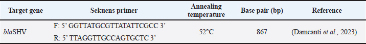 ABSTRACTBackground: Contamination with Klebsiella pneumoniae in food ingredients, including eggs, causes various dangers because it threatens public health, because it acts as a multidrug resistance (MDR) bacteria, especially the extended-spectrum beta-lactamase (ESBL) strain. The ESBL blaSHV gene is part of a broad-spectrum ESBL that is often found in Gram-negative bacteria. Aim: This study aimed to identify the ESBL blaSHV gene in K. pneumoniae MDR from chicken eggshells. Methods: This study used 160 samples of chicken eggshell swabs isolated on 1% BPW media from 10 traditional Surabaya markets. Samples were isolated using MCA media and were identified using Gram staining and biochemical tests. Detection of MDR using Muller-Hinton Agar. Results: Confirmation of ESBL in multidrug-resistant (MDR) isolates was performed using polymerase chain reaction to detect ESBL genes. The results showed that the isolation and identification of K. pneumoniae bacteria were 25.62% (41/160). Amoxicillin antibiotics showed the highest level of resistance at a percentage of 100% (41/41), followed by antibiotic resistance to erythromycin (90.24% (37/41), Streptomycin antibiotics were 26.82% (11/41), ciprofloxacin (14.63% (6/41), and Tetracycline antibiotic resistance was 7.31% (3/41). The results of MDR from K. pneumoniae showed 34.14% (14/41) of the isolates were then tested by PCR, which showed positive results for the blaSHV gene of 71.42% (10/14). Conclusion: The data from this study confirm the existence of K. pneumoniae bacteria isolated from egg shell swabs carrying the blaSHV gene from MDR isolates. Keywords: K. pneumoniae, MDR, ESBL, public health, egg shell. IntroductionA major global public health concern is food safety because dangerous microbes in food can cause a wide range of illnesses (Widodo et al., 2023; Kendek et al., 2024). Eggs are one of the food components that are commonly contaminated, even though eggs are a significant source of nutrition that delivers high-quality protein, necessary amino acids, vitamins, and minerals, and may be obtained in traditional markets and supermarkets (Kuang et al., 2018). Klebsiella pneumoniae is one of the bacteria that can infect eggs (Kahin et al., 2024). According to research by El Ftouhy et al. (2022), contamination of chicken egg shells by Klebsiella spp. in traditional markets and supermarkets was 24% and 4%, respectively. The contamination of chicken eggs by K. pneumoniae in traditional markets may result from both vertical and horizontal transmission (El Ftouhy et al., 2022). Additional research has demonstrated that agricultural surroundings, farm worker swabs, and egg swab samples are contaminated with K. pneumoniae bacteria (Dela et al., 2023). Gram-negative K. pneumoniae bacteria, which are members of the Enterobacteriaceae family, are frequently found on water surfaces, garbage, plants, soil, and other environmental surfaces. They can produce infectious agents in both humans and animals (Dameanti et al., 2023). Klebsiella pneumoniae is one of the bacteria that is resistant to a number of medications worldwide (Riwu et al., 2022). The prevalence of K. pneumoniae-related resistance has increased to 70% worldwide, and the mortality rate from infections has also increased to 40%–70% (Bradley and Scoular, 2021). According to recent studies, K. pneumoniae isolates have been identified as extensively drug-resistant (XDR) and produce extended-spectrum β-lactamase (ESBLs) and carbapenemases (Owaid and Al-Ouqaili, 2025). Although rarely recognized as a cause of foodborne illness, the presence of resistant and potentially virulent K. pneumoniae in food can pose health risks. This bacterium can be transmitted directly or spread resistance genes to other bacteria in food or the human gut (Hartantyo et al., 2020). One of the most urgent concerns for global public health in the twenty-first century is antimicrobial resistance (AMR) (Ferdinand et al., 2024). AMR is the result of an evolutionary process in which bacteria, fungi, viruses, and parasites develop resistance to antimicrobial medications, such as antibiotics, which are frequently used to treat infections (Salam et al., 2023). Contamination of food products with resistant bacteria occurs because animals and plants that serve as food sources for humans can act as vectors for the transfer of antimicrobial-resistant bacteria and AMR genes to humans. In addition, direct contact between humans and infected animals or environments, or with biological substances they produce, such as blood, urine, feces, saliva, and semen, can contribute to an increase in AMR (Chang et al., 2015). One of the various ways that bacteria develop resistance to antibiotics is by transferring resistance genes through plasmids (Benz et al., 2021; Khairullah et al., 2024). The genes blaSHV, blaTEM, and blaCTX-M are found on the chromosome or plasmid and regulate the β-lactamase enzyme manufacturing (Effendi et al., 2018; Pourhossein et al., 2020). The ESBL enzyme, which is commonly found in K. pneumoniae, is responsible for 20% of plasmid-mediated penicillin group resistance, specifically SHV (Yuwono, 2013). The Gram-negative bacteria Enterobacteriaceae produce extended-spectrum beta-lactamases, which are enzymes that hydrolyze penicillins as well as first, second, and third-generation cephalosporins and the aztreonam group (Ansharieta et al., 2021). These enzymes are inhibited by beta-lactamase inhibitors such as clavulanate, sulbactam, and tazobactam (Ghafourian et al., 2015). Hussein et al. (2024) concluded that the high levels of antibiotic resistance observed in K. pneumoniae isolates, particularly those categorized as multidrug-resistant (MDR), XDR, and pandrug-resistant, are influenced not only by β-lactamase production, such as ESBL and metallo-β-lactamase, but also by the overexpression of efflux pump genes and reduced outer membrane permeability due to porin loss. These combined mechanisms significantly enhance 