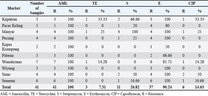 Fig. 2. Antibiotic resistance patterns of across different markets. Description: AML=Amoxicillin; TE=Tetracycline; S=Streptomycin; E=Erythromycin; CIP=Ciprofloxacin. Table 4. MDR incidence rate against K. pneumoniae bacteria.