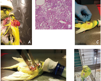 Fig. 1. (A) The patient at presentation showing a large, ulcerate, exophytic mass on the left wing. (B) The histological appearance of the tumor made up by a mixture of areas of epithelioid hemangioendothelioma and areas of low-grade angiosarcoma (H&E; original magnification × 10). (C) Bleomycin is locally injected in the tumor bed. (D) Permeabilizing electric pulses are administered using plate electrodes. (E) The patient at 3-months follow-up showing no evidence of disease. DiscussionIn avian species, tumors of endothelial origin, such as hemangiomas, hemangioendothelioma, and hemangiosarcomas, have primarily been described in chickens (Soffer et al., 1990) mostly having a viral etiology (Masegi et al., 1993). Scant reports of tumors of endothelial cell origin have been documented in non-poultry avian species (Suedmeyer et al., 2001; Sledge et al., 2006; Kline et al., 2016; Rossi et al., 2016). A subcutaneous hemangiosarcoma has been reported in a golden pheasant (Suedmeyer et al., 2001) and in a cockatiel (Sledge et al., 2006). In both cases, the tumor rapidly recurred after the surgical excision, resulting in euthanasia. In our case, the incomplete excision of the vascular neoplasm, albeit being classified as a low grade, still might result in tumor recurrence. ECT, the amalgamation of high-voltage electric pulses and chemotherapy agents, has been shown to be exceedingly effective at controlling incompletely excised cutaneous and subcutaneous tumors regardless of histologic origin (Spugnini and Baldi, 2014). In the current case, bleomycin was chosen because it is the agent most potentiated by ECT. The extensive nature of the lesion prevented wide excision, resulting in marginal tumor removal. Because of limited knowledge on the systemic administration of chemotherapeutics in avian, the budgeteer was locally treated with bleomycin. ECT was well tolerated by the patient and no tumor recurrence was observed in the 12 months post-treatment. In conclusion, ECT is becoming an additional adjuvant modality in exotic animals for locally invasive and/or incompletely excised neoplasms. Conflict of interestEnrico P. Spugnini and Alfonso Baldi are stockholders of Biopulse S.r.l. ReferencesBaker, J.R. 1980. A survey of causes of mortality in budgerigars (Melopsittacus undulatus). Vet. Rec. 106, 10&x2013;12. Billings, S.D., Folpe, A.L. and Weiss, S.W. 2003. Epithelioid sarcoma-like hemangioenothelioma. Am. J. Surg. Pathol. 27, 48&x2013;57. Brunner, C.H., Dutra, G., Silva, C.B., Silveira, L.M. and Martins, Mde.F. 2014. Electrochemotherapy for the treatment of fibropapillomas in Chelonia mydas. J. Zoo Wildl. Med. 45, 213&x2013;218. Deyrup, A.T., Tighiouart, M., Montag, A.G. and Weiss, S.W. 2008. Epithelioid hemangioendothelioma of soft tissue: a proposal for risk stratification based on 49 cases. Am. J. Surg. Pathol. 32, 924&x2013;927. Freeman, K.P., Hahn, K.A., Adams, W.H., Jones, M.P. and Petersen, M.G. 1999. Radiation therapy for hemangiosarcoma in a budgerigar. J. Avian Med. Surg. 13, 40&x2013;44. Gulbahar, M.Y., Ozak, A., Guvenç, T. and Yarim, M. 2005. Retrobulbar rhabdomyosarcoma in a budgerigar (Melopsittacus undulatus). Avian Pathol. 34, 486&x2013;488. Hernández, V., Carrera, E., Méndez, A., Morales, J.C., Morales, E. and Sánchez, F.D. 2012. Histopathologic, immunohistochemical and ultrastructural features of a granular cell tumour in an Australian parakeet (Melopsittacus undulatus). Avian Pathol. 41, 437-440. Jakab, C., Balka, G., Szabára, A., Csaba, C. and Pazár, P. 2013. A case of cutaneous angiolipoleiomyoma (angiomyolipoma) in a budgerigar (Melopsittacus undulatus). Avian Pathol. 42, 511&x2013;515. Jinghong, X. and Lirong, C. 2011. Pulmonary epithelioid hemangioendothelioma accompanied by bilateral multiple calcified nodules in the lung. Diagn. Pathol. 6, 21. Kline, Z.F., Whittington, J.K. and Coleman, D.A. 2016. Cutaneous Hemangiosarcoma in a Pacific Parrotlet (Forpus coelestis). J. Avian Med. Surg. 30, 152&x2013;158. Lanza, A., Baldi, A. and Spugnini, E.P. 2015. Surgery and electrochemotherapy for the treatment of cutaneous squamous cell carcinoma in a yellow-bellied slider (Trachemys scripta scripta). J. Am. Vet. Med. Assoc. 246, 455&x2013;457. Lanza, A., Pettorali, M., Baldi, A. and Spugnini, E.P. 2017. Surgery and electrochemotherapy treatment of incompletely excised mammary carcinoma in two male pet rats (Rattus norvegicus). J. Vet. Med. Sci. 79, 623&x2013;625. Li, X.M., Lin, X.Y., Xu, H.T., Yu, J.H., Wang, L., Fan, C.F., Liu, Y. and Wang, E.H. 2013. Mediastinal epitheloid hemangioendothelioma with abundant spindle cells and osteoclast-like giant cells mimicking malignant fibrous histiocytoma. Diagn Pathol. 8, 103. Lin, Y., Xia, J., Zhao, Y., Wang, F., Yu, S., Zou, N., Wen, X., Cao, S. and Huang, Y. 2013. Reproduction of hemangioma by infection with subgroup J avian leukosis virus: the vertical transmission is more hazardous than the horizontal way. Virol. J. 10, 97. Masegi, T., Inoue, Y., Yanai, T. and Ueda, K. 1993. An ultrastructural study of cutaneous hemangioma in two chickens. J. Vet. Med. Sci. 55, 185&x2013;188. Mentzel, T., Beham, A., Calonje, E., Katenkamp, D. and Fletcher, C.D. 1997. Epithelioid hemangioendothelioma of skin and soft tissues: clinicopathologic and immunohistochemical study of 30 cases. Am. J. Surg. Pathol. 21, 363&x2013;374. Nau, M.R., Carpenter, J.W., Lin, D., Narayanan, S. and Hallman, M. 2017. Mucoepidermoid Carcinoma in the Skull of an Orange-winged Amazon Parrot (Amazona amazonica). J. Avian Med. Surg. 31, 225&x2013;231. Owen, H.C., Doneley, R.J., Schmidt, R.E. and Patterson-Kane, J.C. 2007. Keratoacanthoma causing beak deformity in a budgerigar (Melopsittacus undulatus). Avian Pathol. 36, 499&x2013;502. Racnik, J., Svara, T., Zadravec, M., Gombac, M., Cemazar, M., Sersa, G. and Tozon, N. 2017. Electrochemotherapy with Bleomycin of Different types of Cutaneous Tumours in a Ferret (Mustela Putorius Furo). Radiol. Oncol. 52, 98&x2013;104. Racnik,