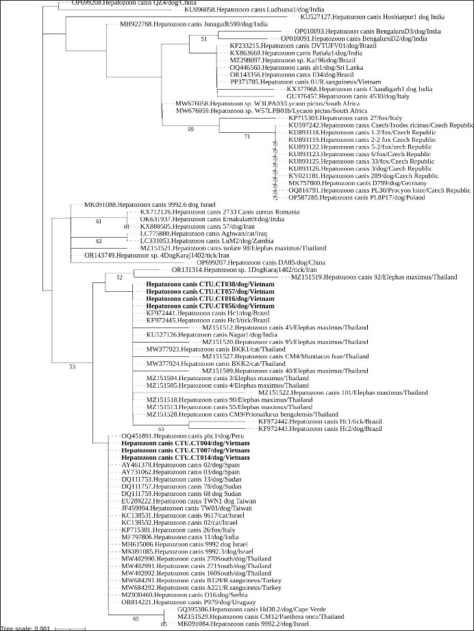 AbstractBackground: Hepatozoon canis (H. canis) is an intracellular protozoan parasite transmitted by ingestion of infected ticks. It is responsible for canine hepatozoonosis, a disease that affects the health and well-being of dogs worldwide. The infection can range from subclinical to severe, depending on the host’s immune status and parasite burden. Hepatozoon canis has been reported in multiple regions, but data on its prevalence and genetic characteristics in Vietnam, particularly in Can Tho City, remains limited. Aim: To determine the infection rate and genetic characteristics of H. canis in dogs in Can Tho City, Vietnam. Methods: A total of 359 suspected cases of H. canis presented to veterinary hospitals between January and November 2024 were investigated. Molecular diagnosis was performed using polymerase chain reaction, and positive samples were sequenced. The resulting sequences were compared with reference H. canis strains in GenBank to assess genetic similarity and variation. Results: The overall infection rate of H. canis was 0.75% and 9.47% among the surveyed dogs and suspected cases, respectively. Genetic analysis showed high similarity (98.88%–100%) between the three local and global reference strains. Four high-entropy loci were observed: 208 (G→A), 217 (T→C), 450 (C→T), and 474 (C→T), with the highest entropy at position 450 (0.682), suggesting regional genetic variation and potential selective pressure. Transition bias analysis revealed a strong preference for pyrimidine transitions (T↔C), indicating conservation in key regions. Conclusion: To the best of our knowledge, this is the first comprehensive genetic characterization of H. canis in dogs in Can Tho City. Despite a low prevalence of infection, genetic analysis revealed significant local variation. These findings enhance our understanding of the molecular epidemiology and evolution of H. canis and emphasize the need for further studies to elucidate the clinical implications of genetic polymorphisms. Keywords: Molecular epidemiology, Hepatozoon canis, Tick-borne pathogen, 18S rRNA gene, Vietnam. IntroductionHepatozoon canis, first identified in India in 1905, is a tick-borne apicomplexan protozoan that infects domestic and wild canids across diverse geographic regions, including Asia, Africa, and Europe (Baneth, 2011; Miterpáková et al., 2017). All Hepatozoon spp. share a basic lifecycle, involving sporogonic development in a hematophagous invertebrate host, followed by gametogenesis and sporulation in a vertebrate intermediate host (Baneth et al., 2007). Hepatozoon canis sporozoites spread via the blood and lymphatic system to several organs, including the spleen, bone marrow, lungs, liver, and kidneys, infecting leukocytes and parenchymal tissue cells (Vásquez-Aguilar et al., 2021). Hepatozoonosis generally manifests in a chronic form, with no established correlation between the age of affected dogs and H. canis infection. The geographic distribution of H. canis infection is closely associated with Rhipicephalus sanguineus (R. sanguineus), the most widely distributed tick species globally (Giannelli et al., 2013). In Vietnam, the prevalence of tick infestation in dogs was reported at 29.01%, with the brown dog tick (R. sanguineus) being the predominant species (Do et al., 2024), posing a risk for the spread of canine vector-borne diseases, especially under tropical conditions favorable for tick proliferation. Although H. canis has been reported in various countries, molecular and epidemiological data remain limited in Vietnam. According to Nguyen et al. (2021), the prevalence of H. canis in Ho Chi Minh City was 11.33%; however, comprehensive studies in the Mekong Delta have not yet been conducted. This study aimed to investigate the prevalence of H. canis among clinically suspected dogs and to genetically characterize local strains using partial 18S rRNA gene sequencing, given the lack of molecular data from Southern Vietnam, particularly in Can Tho City—a central hub of the Mekong Delta. These findings will help elucidate the genetic diversity and potential epidemiological patterns of H. canis in this region. Materials and MethodsStudy area and samplingDogs exhibiting clinical signs consistent with blood-borne parasitic infections—such as fever, anorexia, lethargy, emaciation, muscle atrophy, anemia, and pale mucous membranes—were initially examined at participating veterinary hospitals in Can Tho City from January to November 2024. The inclusion criteria encompassed dogs presenting with at least two of the aforementioned clinical signs during clinical examination. A total of 359 dogs that met these criteria were enrolled for further testing. Blood smear was examined on all enrolled dogs as an initial screening method to evaluate hemoparasites, although molecular testing was prioritized due to its limited sensitivity. Subclinical cases—dogs lacking observable symptoms—were excluded from this study. Whole blood (2 ml) was collected from each dog via cephalic venipuncture, placed in EDTA K3 anticoagulant tubes, stored in a refrigerated container, and transported to the Faculty of Veterinary Medicine, Can Tho University, for molecular analysis. Hematological data, such as red blood cell count, hemoglobin concentration, and platelet count, were not available for all animals; therefore, anemia was assessed based on mucous membrane pallor. Platelet counts were not systematically evaluated due to resource constraints. This clarification provides transparency regarding the inclusion criteria, screening methods, and limitations of hematological diagnostics. Molecular detection and characterization of H. canisGenomic DNA was isolated from whole blood samples of dogs using a TopPURE® RNA/DNA Viral Extraction Kit (ABT, Vietnam). The DNA sample was eluted in 50 μl of EB buffer, and the concentration of the pure DNA was determined using a NanoDrop™ 2000 spectrophotometer (Thermo Scientific™)