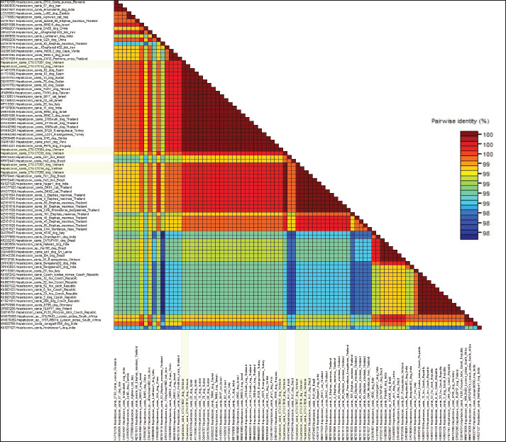 Fig. 3. Color-code matrix of pairwise identity scores generated by the alignment of nucleotide sequences of the gene 18S rRNA region of H. canis strains isolated in Can Tho city in Mekong Delta, Vietnam and representative isolates from other countries. Sequences identified from dogs in this study are marked in lemon yellow. Specifically, the sequences of strains CTU.CT004, CTU.CT007, and CTU.CT014 showed 100% nucleotide identity with partial sequences from dogs in Peru (OQ451891), Spain (AY461378, AY731062), Sudan (DQ111753, DQ111757, DQ111759), Israel (MH615006, MK091085), Uruguay (OR814221), Serbia (MZ930460), India (MF797806), Taiwan (EU289222, JF459994), Thailand (MW402990-MW402992), as well as sequences from H. canis isolated from cats in Israel (KC138531, KC138532), foxes in Italy (KP715301), and R. sanguineus ticks in Turkey (MW684291, MW684292). In contrast, the CTU.CT38, CTU.CT7, CTU.CT16, and CTU.CT56 strains demonstrated 99.6%–100% nucleotide similarity with the sequences isolated from dogs in Brazil (KF972441, KF972443) and India (KU527126). They also shared identity with sequences from isolates found in other animals, including cats (MW377923, MW377924), Prionailurus bengalensis (MZ151528), Muntiacus feae (MZ151527), and Elephas maximus (MZ151504, MZ151505, MZ151509, MZ151512, MZ151513, MZ151518, MZ151520, MZ151522) in Thailand, as well as ticks (KF972445, KF972442) in Brazil. These findings indicate the presence of at least two H. canis sublineages circulating in Can Tho. Furthermore, the studied strains were clustered into separate clades and shared 99.1%–99.3% nucleotide identity with the PP373785 strain isolated from R. sanguineus in Northern Vietnam, indicating intra-national genetic variability. However, the lowest nucleotide identity (98.3%–98.9%) was observed between sequences in this study and isolates from dogs in China (OP699208), India (KU096058, MH922768, and KU527127), and isolates from foxes (KY021181, KU893118–KU893126) in the Czech Republic. This reflects possible regional evolutionary divergence and adaptation. Each entry shows the substitution probability (r) from one base (row) to another base (column) (Kumar et al., 2018). The sum of the r values was normalized to 100. Transition substitutions were predominant, especially between pyrimidines (T↔C), which were notably high. Nucleotide frequencies were 27.68% (A), 32.80% (T/U), 23.31% (C), and 16.21% (G) (Table 3). The transition/transversion rate ratios were k1=0.138 (purines) and k2=30.585 (pyrimidines). The overall transition/transversion bias was R=9.519. This indicates a strong preference for transitions, especially T↔C, contributing to the genetic stability of the 18S rRNA gene. Table 3. This section presents the Maximum Composite Likelihood Estimate (MCLE) of nucleotide substitution patterns for the 18S rRNA gene of H. canis.