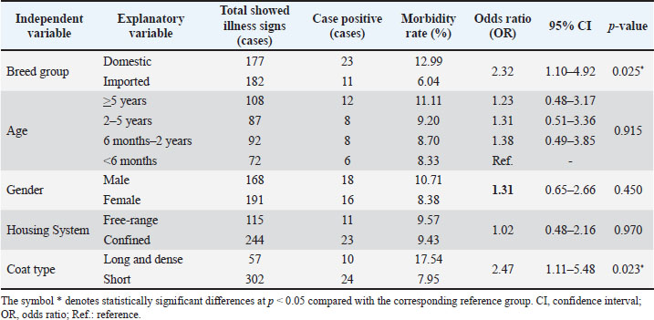 | Pubmed Style Thao TT, Thien NT, Gia LD, Thu KT, Tham DT, Chien NTP, Bich TN. Molecular characterization of Hepatozoon canis in dogs from Can Tho in Vietnam. Open Vet. J.. 2025; 15(10): 5273-5283. doi:10.5455/OVJ.2025.v15.i10.44 Web Style Thao TT, Thien NT, Gia LD, Thu KT, Tham DT, Chien NTP, Bich TN. Molecular characterization of Hepatozoon canis in dogs from Can Tho in Vietnam. https://www.openveterinaryjournal.com/?mno=244413 [Access: January 26, 2026]. doi:10.5455/OVJ.2025.v15.i10.44 AMA (American Medical Association) Style Thao TT, Thien NT, Gia LD, Thu KT, Tham DT, Chien NTP, Bich TN. Molecular characterization of Hepatozoon canis in dogs from Can Tho in Vietnam. Open Vet. J.. 2025; 15(10): 5273-5283. doi:10.5455/OVJ.2025.v15.i10.44 Vancouver/ICMJE Style Thao TT, Thien NT, Gia LD, Thu KT, Tham DT, Chien NTP, Bich TN. Molecular characterization of Hepatozoon canis in dogs from Can Tho in Vietnam. Open Vet. J.. (2025), [cited January 26, 2026]; 15(10): 5273-5283. doi:10.5455/OVJ.2025.v15.i10.44 Harvard Style Thao, T. T., Thien, . N. T., Gia, . L. D., Thu, . K. T., Tham, . D. T., Chien, . N. T. P. & Bich, . T. N. (2025) Molecular characterization of Hepatozoon canis in dogs from Can Tho in Vietnam. Open Vet. J., 15 (10), 5273-5283. doi:10.5455/OVJ.2025.v15.i10.44 Turabian Style Thao, Tran Thi, Nguyen Thanh Thien, Luu Dac Gia, Kha Thanh Thu, Dang Thi Tham, Nguyen Tran Phuoc Chien, and Tran Ngoc Bich. 2025. Molecular characterization of Hepatozoon canis in dogs from Can Tho in Vietnam. Open Veterinary Journal, 15 (10), 5273-5283. doi:10.5455/OVJ.2025.v15.i10.44 Chicago Style Thao, Tran Thi, Nguyen Thanh Thien, Luu Dac Gia, Kha Thanh Thu, Dang Thi Tham, Nguyen Tran Phuoc Chien, and Tran Ngoc Bich. "Molecular characterization of Hepatozoon canis in dogs from Can Tho in Vietnam." Open Veterinary Journal 15 (2025), 5273-5283. doi:10.5455/OVJ.2025.v15.i10.44 MLA (The Modern Language Association) Style Thao, Tran Thi, Nguyen Thanh Thien, Luu Dac Gia, Kha Thanh Thu, Dang Thi Tham, Nguyen Tran Phuoc Chien, and Tran Ngoc Bich. "Molecular characterization of Hepatozoon canis in dogs from Can Tho in Vietnam." Open Veterinary Journal 15.10 (2025), 5273-5283. Print. doi:10.5455/OVJ.2025.v15.i10.44 APA (American Psychological Association) Style Thao, T. T., Thien, . N. T., Gia, . L. D., Thu, . K. T., Tham, . D. T., Chien, . N. T. P. & Bich, . T. N. (2025) Molecular characterization of Hepatozoon canis in dogs from Can Tho in Vietnam. Open Veterinary Journal, 15 (10), 5273-5283. doi:10.5455/OVJ.2025.v15.i10.44 |