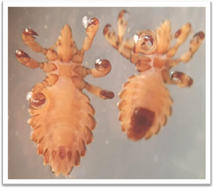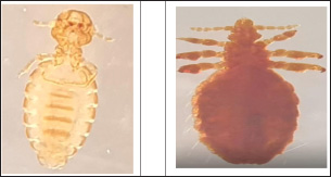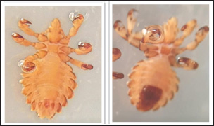 Fig. 1. Male and female lice of Haematopinus tuberculatus. DiscussionLice are a group of external parasites that most commonly infest a range of domesticated animals, including goats, with a substantially harmful impact on productivity. In fact, lice infestation can produce a variety of harmful outcomes, such as loss of appetite, loss of strength, emaciation, decreased milk yields, and weight loss. Furthermore, ectoparasites may cause skin infections, pruritus, and degradation of skin quality and may contribute to anemia. Goat lice are specialized epidermal skin parasites of goats and sheep that often induce skin infection and pruritus. Lice are ectoparasitic blood-sucking flies that are permanent hosts of their hosts and thus suck blood for their entire life as nodes as full-grown nymphs.