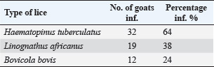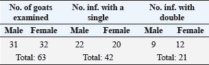Table 2. Number of examined and infected goats according to sex and type of infestation.