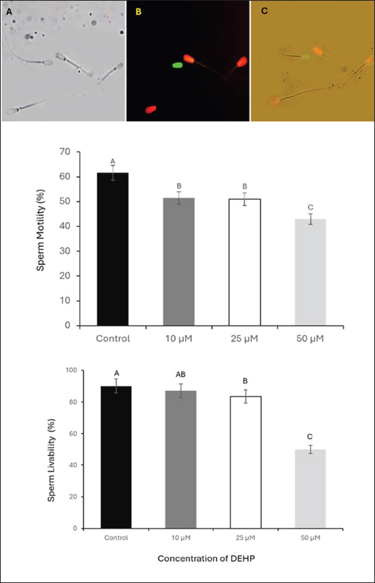 Fig. 1. Assessment of sperm motility and viability following DEHP exposure. The upper panel illustrates sperm viability using propidium iodide (PI) and SYBR 14 staining. (A) Bright-field microscopy image of spermatozoa. (B) Fluorescence microscopy image, where live spermatozoa appear green (stained with SYBR 14) and dead spermatozoa appear red (stained with PI). (C) Merged fluorescence image combining both stains scale bar=50 μm. The lower panel presents column graphs depicting the effects of different concentrations of DEHP (10, 25, and 50 μM) on sperm motility and viability percentages across experimental groups. Different letters indicate statistically significant differences among groups (p < 0.05).