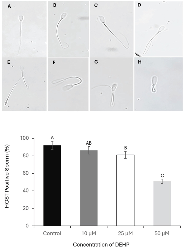 Fig. 2. Evaluation of the effects of different DEHP concentrations on sperm membrane integrity using the HOST. Images from A to H show spermatozoa classified as HOST-positive, exhibiting increasing degrees of tail coiling (×40 magnification). The lower panel presents a column graph illustrating the effect of different DEHP concentrations (10, 25, and 50 μM) on sperm membrane integrity across the experimental groups. Different letters indicate statistically significant differences among groups (p < 0.05). Assessment of sperm plasma membrane integrityThe HOS was used to evaluate the integrity of the plasma membrane of sperm. Briefly, the sperm sample (100 μl at 20 × 106 sperm/ml) was added to a prewarmed HOS reagent (900 μl) and incubated at 37°C for 60 minutes. All sperm with swollen and/or curled tails at different degrees were considered sperm with intact plasma membranes (different patterns of response shown in Fig. 2). The percentage of HOS-positive sperm was calculated for 400 sperm (Akhter et al., 2008).
