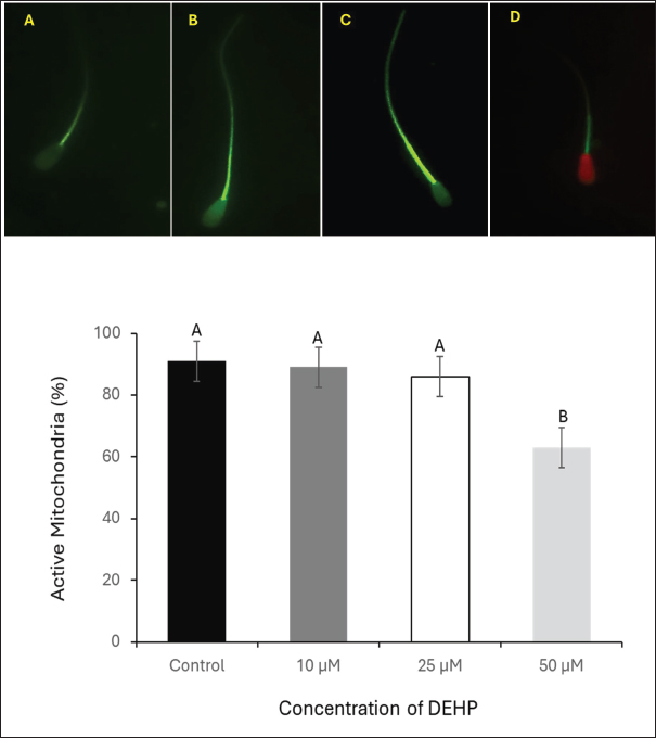 Fig. 3. Assessment of the effect of different DEHP concentrations on MMP in spermatozoa stained with Mito Tracker Green. (A) Sperm exhibiting faint fluorescence, indicating low MMP. (B) Sperm with disorganized mitochondrial staining. (C) Sperm displaying intense fluorescence, representing high MMP and mitochondrial integrity. (D) Sperm with compromised MMP, costained with Propidium Iodide (PI); scale bar=50 μm. The lower panel presents column graphs illustrating the effects of different DEHP (10, 25, and 50 μM) on sperm mitochondrial activity in the experimental groups. Different letters indicate statistically significant differences among groups (p < 0.05). Assessment of sperm mitochondrial activityThe MMP was assessed using MitoTracker Green, a dye that selectively stains active mitochondria. Sperm samples at 20 × 106 sperm/ml) were incubated with Mito Tracker Green (1 μM) for 20 minutes at 37°C in the dark. The fluorescence microscope was set with an excitation wavelength of 488 nm and an emission range of 500–540 nm. Imaging was performed using a 40× objective lens (modified from Madeja et al., 2021). Sperm with low intensity or faint fluorescence in the midpiece, indicating reduced mitochondrial activity or compromised (Low MMP). Sperm displaying disorganized mitochondria and irregular or patchy fluorescence along the midpiece, suggesting disrupted mitochondrial function. The uniform and intense fluorescence in the midpiece reflects optimal mitochondrial activity and high mitochondrial membrane potential (HMMP), as shown in Figure 3. The percentage of high MMP was calculated for 400 sperm.