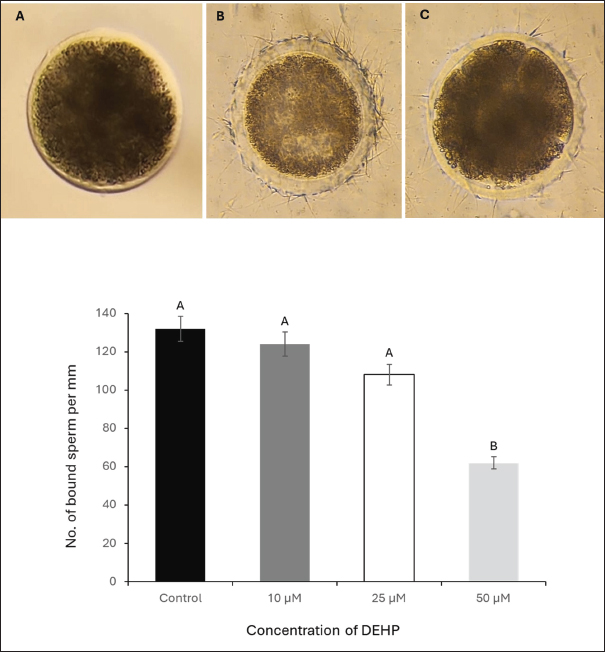 Fig. 4. Effect of different DEHP concentrations on sperm binding to the oocyte zona pellucida under different experimental conditions. (A) Zona pellucida oocyte before sperm binding. (B) The control group displayed a high number of bound sperm, indicating strong binding affinity. (C) Zona pellucida oocyte following exposure to 50 μM DEHP, showing a reduced number of bound sperm, suggesting impaired binding capacity. The column graph represents the effect of different DEHP concentrations on sperm binding ability of the zona pellucida (scale bar=50 μm. Different letters indicate statistically significant differences among groups (p < 0.05). Ovary collection and oocyte preparationA total of 50 ovaries were collected from mature, nonpregnant female camels at a local abattoir within 1–2 hours post-slaughter. Immediately after collection, ovaries were placed in prewarmed saline (PBS), supplemented with 100 IU/ml penicillin and 100 μg/ml streptomycin to reduce microbial contamination during transport. The ovaries were maintained at 37°C in an insulated container and transported to the laboratory within 2–3 hours. In the laboratory, ovaries were washed three times with sterile PBS at 37°C. Follicular fluid from 3–5 mm diameter follicles was aspirated using a 5 ml syringe needle,18-gauge. Cumulus-oocyte complexes (COCs) were selected using a stereomicroscope (Olympus SZX9, Japan) and graded according to their morphology. COCs exhibiting compact cumulus cell layers and homogeneous ooplasm were selected for maturation (Mahmoud et al., 2016). Oocyte maturationA total of 240 COCs (20 per replicate × 4 treatment groups × 3 biological replicates) were selected and subjected to in vitro maturation by culturing them in TCM-199 enhanced with 10% fetal bovine serum, 0.5 µg/ml follicle-stimulating hormone, and 1 µg/ml luteinizing hormone. The COCs were incubated at 38.5°C in a humidified incubator (Thermo Scientific Forma Series II 3110, USA) containing 5% CO2 for 24 hours. Following maturation, the oocytes were denuded by gentle pipetting after exposure to 0.1% hyaluronidase for 2–3 minutes to remove the cumulus cells. After denudation, the oocytes were washed twice in fresh HEPES-buffered TCM-199 and prepared for the sperm-oocyte zona pellucida binding assay (El-Sokary et al., 2021a). Sperm-zona binding assayFor the sperm-oocyte binding, we incubated 20 oocytes per treatment group (5 oocytes per well across 4 wells), repeating the experiment in 3 biological replicates (60 oocytes total per treatment). Denuded mature oocytes were incubated with spermatozoa from camel sperm samples. Sperm were capacitated in modified Tyrode’s albumin lactate pyruvate (TALP) medium supplemented with 10 μg/ml heparin for 30 minutes at 38.5°C in an atmosphere of 5% CO2. After capacitation, 10 µl aliquots of sperm suspension (1 × 106 sperm/ml) were added to each well containing oocytes. The gametes were co-incubated for 4 hours at 38.5°C under 5% CO2. Following incubation, unbound spermatozoa were removed via gentle washing, and the number of bound sperm on the zona pellucida of each oocyte was counted at 400× magnification (Fig. 4). The binding assay was performed in triplicate for each experimental group, and at least 20 oocytes were analyzed for each group. The results were expressed as the average number of sperm bound per oocyte (Primakoff et al., 1985). Retrieval of epithelial cells from the oviductOviducts were collected from apparently healthy pubertal female camels aged 4–8 years old (n=10), slaughtered at a local abattoir and transported to the laboratory at the Animal Reproduction and Artificial Insemination Department, Veterinary Research Institute, National Research Center, on ice. The oviduct epithelial cells were collected and prepared at the laboratory as described by Winters et al. (2018). In brief, the sheet of epithelial cells was stripped from the washed isthmus, collected in PBS, and centrifuged at 84 g for 1 minute. The pellet of cells was disaggregated using a 100-μl pipette 10 times, PBS was added, and centrifuged for 1 minute. Processed cells with TALP media were divided equally into three equal portions in100-mmm tissue culture dishes and incubated at 39°C for 90 minutes to allow cells to reaggregate. For sperm binding, spherical aggregates with a diameter of 100–150 m was selected (Fig. 5). Sperm binding to oviduct epithelial cellsThe sperm binding assay was performed as described by Winters et al. (2018). In brief, 20 oviduct cell explants were added to 20 μ sperm droplets at a final concentration of 1.6 × 106 cells/ml in triplicate. Sperm were then incubated with SYBR-14 (1 μM) for 10 minutes at room temperature in a dark room. Sperm and oviduct cell aggregates were then incubated at 39°C for 30 minutes. The free and loosely attached spermatozoa were washed out with TALP media after the incubation (Modified from El-sokary et al., 2021b). The number of spermatozoa attached to the periphery of each oviduct aggregate was counted and divided by the surface area to estimate the number of bound sperm (Fig. 5). Statistical analysisData (expressed as mean ± SE) were analyzed by ANOVA using IBM SPSS version 22. Tukey’s multiple comparison test was used to identify differences between means. Differences were considered significant at p < 0.05. Ethical approvalAll animal procedures strictly adhere to the established guidelines for animal welfare and ethical research practices. The study protocol was approved by the Ethics Committee of the College of Veterinary Medicine at Benha University (Approval Number: BUFVTM14-10-24). The experiments were carried out in the laboratories of the Animal Reproduction and Artificial Insemination Department, Veterinary Research Institute, Egypt. ResultsEffects of DEHP on sperm motilitySperm motility was assessed at four DEHP concentrations (0, 10, 25, and 50 µM). The control group exhibited the highest percentage of motile sperm at 61.6% 