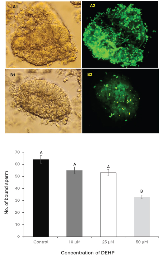 Fig. 5. Effect of DEHP exposure on the sperm binding capacity to oviduct explants. (A1) Isthmus oviduct explant from the control group. (A2) Corresponding fluorescent microscopy image showing abundant sperm attached to the explant (dark green, SYBR 14-stained). (B1) Oviduct explant exposed to 50 μM DEHP before sperm binding. (B2) Fluorescent microscopy image showing a marked reduction in sperm attachment following DEHP exposure. Scale bar=50 μm. The lower panel presents a column graph showing the effect of different DEHP concentrations (10, 25, and 50 μM) on sperm binding capacity to the oviduct explant. Different letters indicate statistically significant differences among groups (p < 0.05). Effect of DEHP on sperm plasma membrane integrityThe integrity of the sperm plasma membrane was evaluated using the HOST. The percentage of HOST-positive sperm, indicating intact plasma membranes, progressively declined with increasing DEHP concentrations. In the control group, 92% ± 1.5% of sperm were HOST-positive, whereas exposure to 10 µM resulted in a slight decrease to 86.3% ± 2.4% of HOST-positive sperm. A more pronounced reduction in membrane integrity was observed at 25 µM DEHP, with 81% ± 2.8% HOST-positive sperm (p < 0.05 compared to the control). The most significant reduction occurred at 50 µM, where only 51% ± 3.7% of sperm remained HOST-positive (p < 0.01 compared to all other groups). The statistical analysis indicated that the control group was significantly different from the 25 µM group (p < 0.05) and the 50 µM group (p < 0.01), as shown in Figure 2. Effects of DEHP on sperm mitochondrial activitySperm MMP was evaluated by assessing the percentage of sperm with HMMP. The control group exhibited the highest percentage of sperm with HMMP at 91% ± 2.0%, followed by the 10 µM group at 89% ± 1.8% and the 25 µM group at 86% ± 2.3%. Exposure to 50 µM DEHP resulted in a marked decrease in the percentage of sperm with HMMP, which dropped significantly to 63% ± 3.5% (p < 0.01 compared to all other groups) (Fig. 3). Impact of DEHP on sperm-zona binding abilityThe effect of DEHP on sperm binding to the zona pellucida was evaluated by assessing the number of sperm bound to the oocyte. In the control group, an average of 64 ± 3.1 sperm were bound to the zona pellucida. The 10 and 25 µM groups showed slight reductions in the number of bound sperm, with 55 ± 2.7 and 53 ± 3.0 bound sperm, respectively. However, at the 50 µM DEHP concentration, the number of bound sperm significantly decreased to 33 ± 2.8 (p < 0.01) compared with the other groups (Fig. 4). DEHP disrupts sperm binding to oviduct epithelial cellsThe effect of DEHP on sperm binding to oviduct epithelial cells was assessed by measuring the number of sperm bound to oviduct explants. The control group had the highest number of bound sperm (132 ± 4.5). The 10 µM group exhibited a slight reduction to 124 ± 3.8, and the 25 µM group exhibited a more pronounced decrease to 108 ± 4.2 sperm. In contrast, the 50 µM DEHP group demonstrated a significant reduction in sperm binding, with only 62 ± 3.9 sperm bound to the oviduct explants (p < 0.01 compared to all other groups). These results suggest that DEHP at lower concentrations (10 and 25 µM) had minimal impact on sperm binding to oviduct epithelial cells, while a significant reduction in binding was observed at the highest concentration of 50 µM (Fig. 5). DiscussionEndocrine disruptors such as DEHP have been widely studied due to their adverse effects on reproduction in various species, including farm animals. DEHP, a common plasticizer, leaches into the environment, leading to widespread exposure to humans and animals. It exerts its toxic effects by mimicking or blocking hormone activity, leading to disruptions in reproductive physiology. DEHP has been shown to impair gametogenesis, reduce sperm quality, and alter reproductive tract functionality, ultimately leading to reduced fertility (Foster, 2006). Studies on livestock have demonstrated that DEHP reduces sperm motility, alters DNA integrity, and negatively impacts the oocyte’s ability to be fertilized (XueXia et al., 2023). However, to the best of our knowledge, this is the first study to evaluate the effect of DEHP on camel sperm fertility. Our study demonstrated that DEHP exposure negatively affects sperm motility in a dose-dependent manner, with a significant decline observed at the highest DEHP concentration (50 µM). The control group exhibited the highest motility (61.6%), with a moderate decrease at 10 µM (51.5%) and 25 µM (50%), before a substantial decrease at 50 µM (43%). These findings indicate that whereas lower concentrations of DEHP (10 and 25 µM) caused a gradual reduction in motility, the most severe impairment occurred at 50 µM, confirming a threshold-dependent toxic effect. The decline in sperm motility at higher DEHP concentrations may be attributed to mitochondrial dysfunction and ATP depletion, as previously reported in mammalian sperm (Huang et al., 2014). DEHP is known to induce oxidative stress, leading to lipid peroxidation and mitochondrial damage, both of which are critical factors in sperm motility impairment (Hosseinzadeh et al., 2021). However, the observed reduction in motility at 10 µM DEHP, despite unaltered mitochondrial function, suggests additional mechanisms beyond oxidative stress. DEHP may disrupt cytoskeletal components such as the axoneme, microtubules, and microfilaments, impairing flagellar movement. Furthermore, it could interfere with intracellular signaling pathways, particularly tyrosine phosphorylation, calcium homeostasis, and cAMP-dependent signaling, which are essential for sperm motility regulation (Yang et al., 2024). Although spermatozoa exhibit resilience at lower DEHP concentrations (10 and 25 µM), intrinsic antioxidant defenses may initially mitigate oxidative damage. However, at 50 µM, these protective mechanisms are overwhelmed, leading 