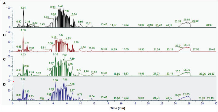 Fig. 1. The TIC of the gelatin standard was extracted using different extraction buffers: bovine gelatin-Tris HCl buffer pH 8.0 (A), bovine gelatin-ammonium bicarbonate pH 8.0 (B), porcine gelatin-Tris HCl buffer pH 8.0 (C), and porcine gelatin-ammonium bicarbonate pH 8.0 (D). Identification of peptide markers using bovine gelatin standardsThe identification of peptide markers from bovine gelatin standards is a critical process in the quality control and characterization of gelatin-derived products. To identify proteins and peptides in gelatin, LC-HRMS with Orbitrap mass analyzer was used. Table 1 shows the peptide markers found in bovine gelatin obtained from two different extraction buffers. In general, Tris-HCl (pH 8.0) and ammonium bicarbonate (pH 8.0) had similar performance in extracting peptides from bovine gelatin. Ten peptide markers of bovine gelatin were obtained using Tris-HCl (pH 8.0), whereas nine peptide markers were found in bovine gelatin using ammonium bicarbonate (pH 8.0). The peptides were obtained from the collagen alpha 1 chain and collagen alpha 2 chain. For all peptides, the same source of protein was found using Tris-HCl (pH 8.0) and ammonium bicarbonate (pH 8.0). Therefore, both extraction solvents resulted in similar results of peptide markers from bovine gelatin, except for the peptide GETGPAGPPGAPGAPGAPGPVGPAGK, which was only detected using Tris-HCl (pH 8.0). Table 1. Identification of peptide markers from bovine gelatin standard obtained from two different buffer extractions of Tris-HCl (pH 8.0) and ammonium bicarbonate (pH 8.0).