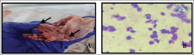 Fig. 1. Tissues revealed cysts containing bradyzoites within the muscle of rabbits. (A) Macrocysts in muscle. (B) Bradyzoites stage of sarcocystis spp in thin tissue impression stained with Giemsa at 100×. Figure 2 appears to show an agarose gel electrophoresis result, typically used to separate DNA fragments for analysis after a PCR reaction. The bands seen in each lane indicate the presence of amplified DNA fragments. The clear, distinct bands means a successful amplification of DNA, while variations in the intensity or clarity of the bands could provide insights into the quality or quantity of the DNA. In this context, the gel is likely being utilized to approve the occurrence of Sarcocystis species DNA after PCR amplification from infected rabbit tissue. The results would help identify which samples were successfully amplified for further sequencing or analysis.