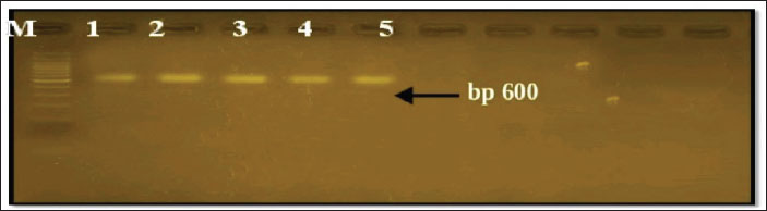 Fig. 3. PCR result for Sarcocystis spp. Based on the 18srRNA region and a reaction product of 600 bp.to the positive samples. The bands visible on the agarose gel indicate that the PCR successfully amplified the 600 bp fragment, which corresponds to the expected size for the 18s rRNA region of Sarcocystis spp. DNA. The presence of clear bands in the lanes indicate a positive detection of the parasite in the analyzed samples. The BLAST alignment result shows a 100% match between our query sequence and the reference sequence of Sarcocystis halieti (small subunit ribosomal RNA gene, GenBank accession: MH130211.1). All 600 base pairs are identical, with no gaps or mismatches. The alignment indicates a perfect match, as evidenced by the E-value of 0.0 and a bit score of 1,164, confirming a highly significant alignment. This submits that the organism in our sample is either S. halieti or a closely related species established on the 18S rRNA gene region. Phylogenetic Tree for Analyzing Sarcocystis spp.: S. halieti (No. EES1: LC830205), S. japonica (No. ESS2: LC830206), Sarcocystis speeri (ESS3 LC830207), and Sarcocystis zamani (ESS4 LC830208), established on 18SrRNA Gene Sequence in local rabbit isolates from Mosul city that shown in Table 5. Table 5. Homology using BLAST n between the local sequence of Sarcocystis.spp. (ESS1, ESS2, ESS3, ESS4) and other genotypes.