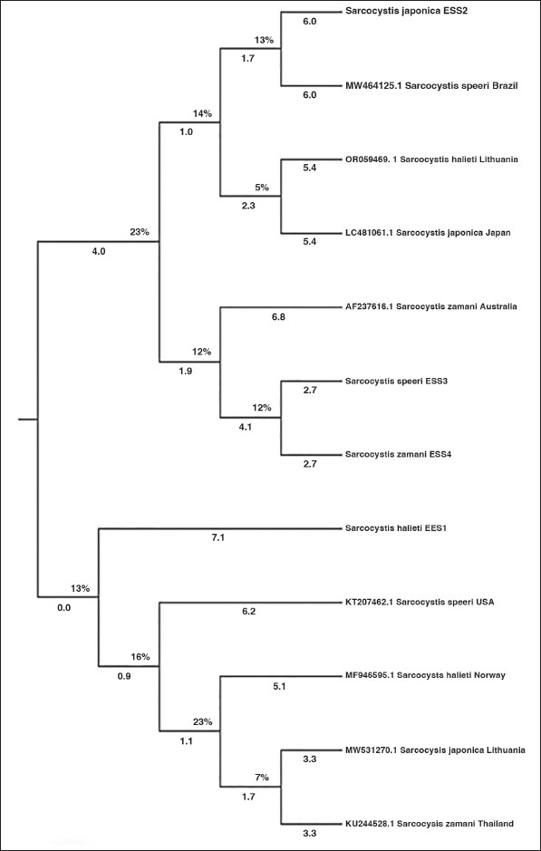 Analysis resultsGenetic diversityThe phylogenetic tree analysis indicates genetic diversity among local Sarcocystis isolates and other registered isolates in databases. Genetic Classification S. halieti (No. EES1: LC830205), S. japonica (No. ESS2: LC830206), S. speeri (ESS3 LC830207), and S. zamani (ESS4 LC830208). This analysis aids in the classification of genetic species, contributing to the understanding of biological diversity and the evolution of Sarcocystis spp. across different regions. Figure 4 will provide a visual representation of the phylogenetic tree, illustrating the relationships between different isolates based on the 18SrRNA gene sequence, which aids in understanding the kinship and genetic diversity among them.