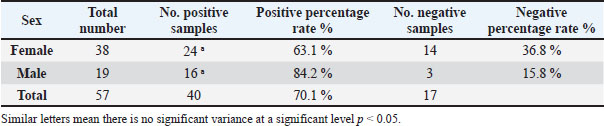 The steps show for amplifying 18S rRNA, detailing each stage of the reaction, including denaturation, annealing, and final extension to ensure amplification. The tubes were placed in a thermocycler to perform the reactions as described (Hamidinejat et al., 2014; Pestechian et al., 2021): Initial denaturation: At 95°C for 6 minutes to disruption the hydrogen bonds in the DNA and separate the strands; Repeated denaturation (35 cycles): Performed at 95°C for 45 seconds. This stage is crucial to keep the strands separated for effective binding; Annealing (Repeats 35 times): After denaturation, the reaction proceeds with annealing at 58°C for 1 minute, allowing the primers to collabrate specifically to their supplementary sequences in use single-stranded DNA; Extension (Repeats 35 times): The extension step follows, where the heat is elevated near 72°C used for 1 minute. At this best heating, Taq polymerase manufactures new DNA strands by increment nucleotides to the primer-bound regions; Final Extension: After completing 35 rotations, an eventual extension next to 72°C used for 5 minutes, assure that any remaining single-stranded DNA is fully extended. This detailed PCR program ensures the efficient amplification of the target 18S rRNA region, facilitating the molecular identification of Sarcocystis spp. Nucleotide sequencing of amplified fragments based on DNA sequencing technologyThe nucleotide sequences of the specimen (Sarcocystis spp.) under study were determined. The PCR products of the aforementioned sampling, along with the primers for the resulting fragment, were sent for sequencing using the Psomagen device in the USA. The gene sequences were compared with documented gene sequences in the National Center for Biotechnology Information (NCBI), and the outcomes were investigated via the BLAST program. Following this, the NCBI BLAST (BLASTn) from NCBI (http://www.ncbi.nlm.nih.gov) was used to compare the sequences with other sequences that were available in GenBank. With MEGA11 software, the Likelihood method on the Tamura-Nei model and bootstrap analysis with 1,000 resamplings. Statistical analysisChi-square tests were calculated using SPSS version 19 to determine the divergence in the pervasiveness of Sarcocystis spp. Variances with a p value <0.05 were measured statistically significant. Ethical approvalEthical approval was gained from the Ethics Committee or the Academic Committee of the Microbiology Department, Veterinary Medicine College, Mosul University, on October 1, 2023. ResultsThe Table 2 shows the infection rate of Sarcocystis spp. in rabbits from Mosul city, categorized by the gender of the rabbits. A whole of 57 rabbits were tested, with 40 rabbits 70.2% testing positive for infection. Table 2. The infection rate with Sarcocystis spp. in rabbits in Mosul city according to the sex of rabbit.