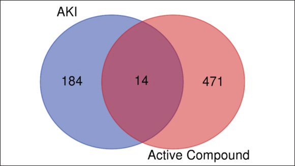 Fig. 2. Intersection of target genes between active compounds and AKIs. The blue circle represents AKI-related targets, whereas the red circle indicates active compound-associated targets. This overlapping section highlights the anti-AKI targets that interact with the active compounds in the combined extract. The blue circle represents AKI-related targets, whereas the red circle indicates active compound-associated targets. This overlapping section highlights the anti-AKI targets that interact with the active compounds in the combined extract. ConclusionA total of 40 compounds identified in C. longa and C. zedoaria extracts mixed with 96% ethanol were classified as sesquiterpenoids, alkaloids, and sesquiterpenes. Among them, 22 bioactive compounds were linked to 14 overlapping therapeutic targets for AKI, suggesting their potential role in AKI treatment or prevention and providing a foundation for further drug development. Further studies involving experimental validation, such as in vivo and in vitro assays, are necessary to strengthen the findings on the therapeutic mechanisms of the combined C. longa and C. zedoaria extracts. Additionally, more detailed investigations of metabolite stability during extraction and the impact of interindividual variability on the composition of bioactive compounds are recommended to support future clinical applications. AcknowledgmentsThe authors thank Indonesia’s National Research and Innovation Agency for funding this study. Conflict of interestThe authors declare that they have no conflicts of interest. FundingThis study was funded by the National Research and Innovation Agency (BRIN) of Indonesia as part of its Research Project Program for the 2024 Fiscal Year. Authors’ contributionPRI, SSM, LNS, AS, and EH conceived and designed the study. PRI, SA, AI, LW, FD, ASA, SSM, LNS, AS, and EH contributed to data analysis and interpretation. PRI, SA, AI, LW, DS, FD, ASA, SSM, LNS, AS, and EH drafted the manuscript. PRI, SA, AI, LW, DS, FD, ASS, SSM, LNS, AS, and EH critically revised the manuscript. PRI, SSM, LNS, AS, and EH supervised this study. PRI, SA, AI, LW, DS, FD, ASA, SSM, LNS, AS, and EH contributed to the final approval of the manuscript. Data availabilityThis manuscript contains all the necessary information to corroborate the results of this study. ReferencesAnandika, O., Sri, N., Setiyono, A. and Kusnandar, F., 2024. LC-MS metabolomics and molecular docking approaches to identify antihyperglycemic and antioxidant compounds from melastoma malabathricum L. Leaf. Saudi J. Biol. Sci. 31(8), 104047. Budiman, A., Rusdin, A., Wardhana, Y.W., Puluhulawa, L.E., Cindana Mo’o, F.R., Thomas, N., Gazzali, A.M. and Aulifa, D.L. 2024. Exploring the transformative potential of functionalized mesoporous silica in enhancing antioxidant activity: a comprehensive review. Antioxidants 13(8), 1–30. Chan, S.W., Lee, C.Y., Yap, C.F., Wan Aida, W.M. and Ho, C.W. 2009. Optimization of extraction conditions for phenolic compounds from limau purut (Citrus hystrix) peels. Food Res. J. 16(2), 203–213. Cox-Singh, J., Davis, T.M.E., Lee, K.S., Shamsul, S.S.G., Matusop, A., Ratnam, S., Rahman, H.A., Conway, D.J. and Singh, B., 2008. Plasmodium knowlesi malaria in humans is widely distributed and potential life threatening. Clin. Infect. Dis. 46(2), 165–171. Dhal, Y., Deo, B. and Sahu, R.K. 2012. Comparative antioxidant activity of nonenzymatic and enzymatic extracts of Curcuma zedoaria, Curcuma angustifolia, and Curcuma caesia. Int. J. Plant, Anim. Environ. Sci. 2(4), 232–239. Dong, Y., Zhao, Q. and Wang, Y. 2021. Network pharmacology–based investigation of potential targets of astragalus membranaceous-angelica sinensis compound acting on diabetic nephropathy. Sci. Rep. 11(1), 1–16. Drosou, C., Kyriakopoulou, K., Bimpilas, A., Tsimogiannis, D. and Krokida, M. 2015. A comparative study of different extraction techniques to recover red grape pomace polyphenols from vinification byproducts. Ind. Crop. Prod. 75, 141–149. Fuloria, S., Mehta, J., Chandel, A., Sekar, M., Rani, N.N.I.M., Begum, M.Y., Subramaniyan, V., Chidambaram, K., Thangavelu, L., Nordin, R., Wu, Y.S., Sathasivam, K. V., Lum, P.T., Meenakshi, D.U., Kumarasamy, V., Azad, A.K. and Fuloria, N.K. 2022. A comprehensive review of the therapeutic potential of Curcuma longa linn. In relation to its major active constituent curcumin. Front. Pharmacol. 13, :1–27., 2019 Gharge, S., Hiremath, S.I., Kagawad, P., Jivaje, K., Palled, M.S., Suryawanshi, S.S., Freund, R.R.A., Gobrecht, P., Fischer, D., Arndt, H.D., Kocaadam, B., Şanlier, N., Lobo, R., Prabhu, K.S., Shirwaikar, A., Sato, Y., Takahashi, M., Yanagita, M., Composition, C., Constituent, C., Pan, M., Lei, Q., Zang, N., Zhang, H., Oliveira, M.S., De Pereira, M., Freitas, C., Salazar-Aranda, R., P, L.A., Joel, L., Alan, B.A., Anandika, O., Sri, N., Setiyono, A., Kusnandar, F., Kim, J., Chang, S., Kim, I., Kim, Y., Hwang, J., Kim, K., Kim, W., Rafiee, Z., Jafari, S.M., Alami, M., Khomeiri, M., Drosou, C., Kyriakopoulou, K., Bimpilas, A., Tsimogiannis, D., Krokida, M., Rafi, M., Rismayani, W., Sugiarti, R.M., Syafitri, U.D., Tri, W., Rafi, M., Kedare, S.B., Singh, R.P., Ghasemzadeh, A., Karbalaii, M.T., Jaafar, H.Z.E., Rahmat, A., Rudrapal, M., Pujimulyani, D., Yulianto, W.A., Is, G.O.D., Stanzione, F., Giangreco, I. and Cole, J.C. 2021. Curcuma zedoaria Rosc (Zingiberaceae): a review of its chemical, pharmacological, and biological activities. J. Food Sci. Technol. 37(4), 1–13. Ghasemzadeh, A., Karbalaii, M.T., Jaafar, H.Z.E. and Rahmat, A., 2018. Phytochemical constituents, antioxidant activity, and antiproliferative properties of black, red, and brown rice bran. Chem. the Cent. J. 12(1), 1–13. Ghosh, S.S., Gehr, T.W.B. and Ghosh, S. 2014. Curcumin and chronic kidney disease (CKD): major mode of action by stimulating endogenous intestinal alkaline phosphatase. Molecules 19(12), 20139–20156. Hadi, N.S.A., Bankoglu, E.E., Schott, L., Leopoldsbe