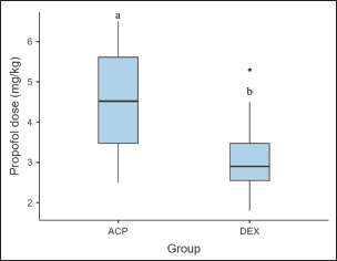 Fig. 1. Total dose of propofol for anesthetic induction in dogs that received premedication with 0.02 mg/kg acepromazine and 0.3 mg/kg methadone (ACP Group) or 2 µg/kg dexmedetomidine and 0.3 mg/kg methadone (DEX Group) (n=12). The boxes show the interquartile range, the whiskers show the minimum and maximum values, and the lines within the boxes represent the medians. Outliers are marked as points. Significance was set at p < 0.05. Different letters indicate statistical differences between groups. The exclusion criteria were conditions requiring alterations in the established protocols, such as allergic reactions to propofol, highly aggressive dogs requiring deeper sedation scores in premedication, continuous medication use (e.g., anxiolytics), complications necessitating additional therapy (e.g., severe bradycardia with hypotension before anesthetic induction), or cases where complete data collection was not possible. Study protocolDogs were randomly randomized into one of two groups using a random number generator (Excel 2016; Microsoft Corporation, WA, USA). The groups differed based on the type of premedication administered: