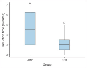 Fig. 2. Time (minutes) for anesthetic induction in dogs that received premedication with 0.02 mg/kg acepromazine and 0.3 mg/kg methadone (ACP Group) or 2 µg/kg dexmedetomidine and 0.3 mg/kg methadone (DEX Group) (n=12). The boxes show the interquartile range, the whiskers show the minimum and maximum values, and the lines within the boxes represent the medians. Outliers are marked as points. Significance was set at p < 0.05. Different letters indicate statistical differences between groups. Following sedation assessment, a peripheral catheter (Descarpack®, Brazil) with an appropriate gauge for the dog’s size was inserted and connected to an adapter plug (Foyomed®, Brazil) in the cephalic vein of the left thoracic limb. After venous access, the surgical site was clipped, and prophylactic antibiotic therapy with 30 mg/kg sodium cefalotin (Cefariston®; Blau Farmacêutica S.A.) was administered intravenously. The dogs were then transferred to the surgical center for anesthetic induction. Anesthetic induction was performed using a continuous infusion of propofol (Propovan® 10 mg/ml; Cristália) at a rate of 1 mg/kg/min via a syringe infusion pump (UniFusion SP50 Pro Vet, MedRena). An initial dose of 5 mg/kg of propofol was prepared in a 20-ml syringe connected to an extension line (Neonatal extension line 120 cm and 5 Fr; Embramed, Brazil), which was attached to a 30 × 0.8 mm hypodermic needle inserted directly into the adapter plug connected to the venous catheter. Induction and intubation were performed by the same experienced anesthetist in all cases. The start time of propofol administration was recorded to calculate the interval between premedication and anesthetic induction. The infusion of propofol was initiated, and the endpoint for stopping administration was determined by the presence of the following characteristics: loss of head support, ventromedial eye rotation, reduced or absent palpebral reflex, and low jaw and tongue tone. Once the anesthetic plane was confirmed, the infusion was stopped, the time was recorded, and the animals were intubated with an appropriately sized endotracheal tube. If intubation resistance was encountered, as demonstrated by a cough reflex, additional propofol would be administered, and the animal would be excluded from the study. Quantification of propofol dose and induction timeThe total propofol dose required for anesthetic induction was calculated by subtracting the residual volume in the syringe from the initial volume and converting the result to mg/kg. The volume in the extension line was disregarded because it was prefilled with propofol beyond the initial volume considered in the syringe. The total induction time was calculated based on the recorded start and end times of continuous infusion. Assessment of physiological variables and myoclonus occurrencePhysiological variables, including heart rate (HR), respiratory rate (RR), and systolic arterial pressure (SAP), were measured and recorded at three time points: before premedication (baseline), immediately before induction (pre-induction), and immediately after intubation (post-induction). During the postinduction period, oxygen saturation (SpO2) and end-tidal carbon dioxide (EtCO2) were also recorded. Two blinded observers recorded the physiological parameters, with one measuring HR and SAP and the other measuring RR, SpO2, and EtCO2. HR was measured via electrocardiographic monitoring using a multiparameter monitor (SDAMONITOR 12; SDAMed, Brazil). SAP was measured in the right thoracic limb using a vascular Doppler (DV 610V; Medmega®, Brazil) fixed in the palmar metacarpal region near the pad and a sphygmomanometer (SDA-ES1; SDAMed, Brazil) with a cuff size corresponding to approximately 40% of the midlimb diameter. Hypotension was defined as SAP 90 mm Hg. RR was determined by counting the respiratory movements for 60 seconds. Some dogs exhibited panting, making counting difficult. In such cases, a standard value of 160 breaths per minute was recorded for statistical purposes, following previous methodologies for panting dogs (Bigby et al., 2017b). Apnea was defined as the absence of respiratory movements for 30 seconds or more (Bigby et al., 2017a; Cattai et al., 2018). SpO2 was measured using a pulse oximeter placed on the tongue, while EtCO2 was recorded via sidestream capnography, with the highest value recorded within the first minute of the postinduction period. The oximeter and capnograph were integrated into the multiparameter monitor. Desaturation was defined as SpO2 below 90%, and hypercapnia was classified as EtCO2 greater than 45 mm Hg. If desaturation or EtCO2 exceeded 60 mm Hg during the monitoring period, manual ventilation was initiated and recorded. The same anesthetist responsible for anesthetic induction assessed the occurrence of myoclonus, which is characterized by involuntary muscle contractions, during propofol administration. The myoclonus score was recorded on a scale ranging from 0 (no contractions) to 3 (intense contractions) (Bell et al., 2011). Oxygen flow and additional anesthetic medications were initiated only after completing the collection of all postinduction parameters. Statistical analysisStatistical analyses were performed using JAMOVI software version 2.5.6. The significance level was set at p < 0.05. Data distribution was assessed using the Shapiro–Wilk test for numerical variables within groups. Data are summarized as mean ± SD for normally distributed variables or median (interquartile range) for nonparametric data. Numerical data between independent groups were compared using the Student’s t-test or Mann–Whitney test. Dependent physiological parameters (HR, RR, and SAP) were analyzed using repeated measures ANOVA or the Friedman test, followed by paired post hoc comparisons to evaluate differences between assessment time points. Ordinal qualitative variables (body condition score and sedation score) were assessed using the Mann–Whit