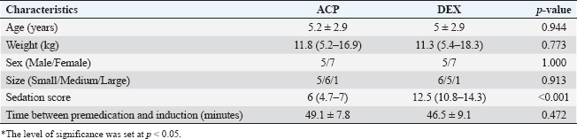 Anesthetic procedureIn a preparation room, all dogs received intramuscular premedication according to their assigned group: acepromazine (Acepran® 0.2%, Vetnil®) or dexmedetomidine (Dexdomitor® 0.5 mg/ml, Zoetis) combined with methadone (MYTedom® 10 mg/ml, Cristália®). The dogs were left undisturbed for 20 minutes. After this period, the sedation score was assessed using a previously published scale (Grint et al., 2009), ranging from 0 (no sedation) to 21 (deep sedation).