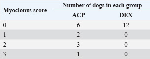 Ethical approvalInformed owner consent was obtained, and the study was approved by the Animal Ethics Committee (CEUA–UNILAVRAS). The research project registered under number 050/2023 was approved by the ethics committee for the use of animals at the Lavras University Center on 08/16/2023. ResultsA total of 24 dogs were included in the study, with 12 animals per group. The surgical procedures performed included orchiectomies (5), ovariohysterectomies (4), dental prophylaxis (7), simple nodulectomies (7), and third eyelid gland repositioning (1). There were no significant differences between the groups in age, weight, sex, size, or time between premedication and anesthetic induction. However, the sedation score was higher in the DEX group (Table 1). The dose of propofol (mg/kg) required for anesthetic induction was higher in the ACP group (4.6 ± 1.3) than in the DEX group (3.1 ± 1.0) (p=0.005) (Fig. 1). Additionally, the induction time (minutes) was longer in the ACP group (4.5 [3–6.25]) than in the DEX group (3 [2.5–3.5]) (p=0.024) (Fig. 2). During anesthetic induction, dogs in the ACP group had a higher incidence of myoclonus (6/12) than those in the DEX group (0/12) (p=0.005). The myoclonus score during anesthetic induction is presented in Table 2. The cardiovascular and respiratory physiological variables are presented in Table 3. In the ACP group, HR decreased between the baseline and pre-induction periods (p=0.008) and increased between the pre- and post-induction periods (p=0.011), with no differences in the final period compared with the baseline. In the DEX group, there was also a decrease in HR between the baseline and pre-induction periods (p < 0.001) and an increase between the pre- and post-induction periods (p=0.014). In the final period, however, HR remained lower than that at baseline (p=0.004). There was no difference between the groups in HR during the baseline period, but in the pre- and post-induction periods, animals in the DEX group had lower HR compared with the ACP group (p < 0.05). Table 2. Myoclonus score during anesthetic induction in dogs included in the study according to the group (ACP – premedication with 0.02 mg/kg acepromazine and 0.3 mg/kg methadone; DEX – premedication with 2 µg/kg dexmedetomidine and 0.3 mg/kg methadone) (n=12).