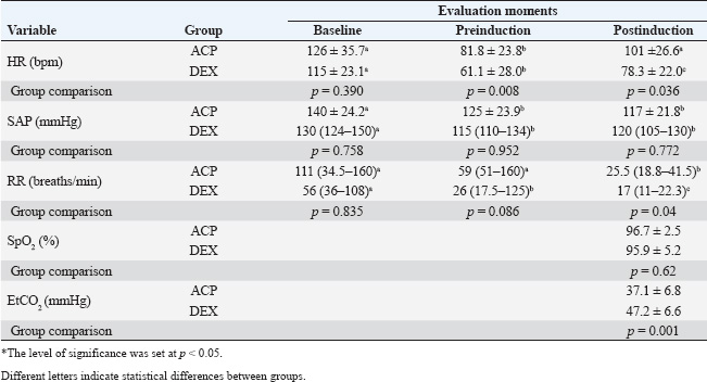 In both groups, there was a reduction in SAP between the baseline and preinduction periods (p < 0.05), with no difference between the pre- and postinduction periods. No hypotension was recorded at any evaluation time, and there were no differences between the groups. The ACP group showed a reduction in RR only between the pre- and post-induction periods (p=0.006), whereas in the DEX group, there was a progressive decrease in RR between all three time points (p < 0.01). In the postinduction period, the RR of the DEX group was lower than that of the ACP group (p=0.04). No animal experienced postinduction apnea. There was no difference between the groups in SpO2, and no animals experienced desaturation. However, the DEX group showed a higher EtCO2 after anesthetic induction compared with the ACP group (p=0.001), with a higher incidence of hypercapnia (p < 0.001) in the DEX group. DiscussionIn healthy dogs, premedication with dexmedetomidine or acepromazine at conservative doses in combination with methadone did not cause a significant cardiopulmonary impact during propofol induction at a rate of 1 mg/kg/min. Dexmedetomidine demonstrates a higher sedation potential, reduced propofol requirement, and provides a smoother induction; however, it also reduces the HR more and induces greater respiratory depression, which may be relevant in clinically unstable animals. Table 3. Cardiovascular and respiratory variables are presented as mean ± SD or median (interquartile range) measured at baseline, pre-induction, and post-induction, according to the group (ACP – premedication with 0.02 mg/kg acepromazine and 0.3 mg/kg methadone; DEX – premedication with 2 µg/kg dexmedetomidine and 0.3 mg/kg methadone) (n=12).