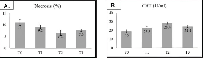 Fig. 3. Diagram showing the addition of green tea extract to egg yolk–milk diluent in (A) necrosis spermatozoa and (B) catalase enzyme (U/ml) post-thawing semen of Gaok chicken.