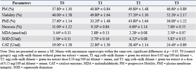 Table 2. Effects of green tea leaf extract (Camelia sinensis) on the semen quality of chicken after freezing.