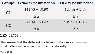 ABSTRACTBackground: Theileria annulata is a protozoan parasite transmitted by ticks that primarily affects cattle and causes tropical theileriosis. This disease is widespread in tropical and subtropical regions and leads to significant economic losses due to fever, anemia, weight loss, and high mortality, especially in susceptible breeds. Infecting rabbits with T. annulata was done to study their immunological and pathological responses in rabbits experimentally infected with T. annulata. Methods: The study included 24 male rabbits divided into two groups (12 rabbits per group). The first group was injected with sterile distilled water and considered the control group. The second group was injected intraperitoneally with a single dose of 0.5 ml of blood from infected cattle containing approximately 3 × 106 T. annulata-infected erythrocytes. Rabbits were selected as an experimental model due to their practicality, distinct immune responses, and suitability for controlled studies of T. annulata pathogenesis. After 14 and 21 days of infection, samples were collected from the rabbits for histopathological and immunological analysis. Results: Theileria annulata piroplasms were observed under a microscope as commas, spots, and rods. The progression of infection was associated with increased body temperature, which is closely related to theileriosis. The infection caused a considerable temperature increase of 39.7°C on the seventh day and 41°C on the thirteenth day. In the infected group, Interferon-gamma (IFN-γ) levels were significantly elevated, whereas IL-10 levels were markedly reduced. Transforming growth factor-beta 1 (TGF-β1) levels displayed a dynamic temporal pattern. The markers of oxidative stress showed a significant increase in malondialdehyde (MDA) levels and a notable decrease in total antioxidant capacity (TAC) levels. Furthermore, infection induces a substantial rise in Immunoglobulin G (IgG) concentrations. Rabbits infected with T. annulata had severe histological abnormalities in their lungs, liver, spleen, kidneys, and mesenteric lymph nodes. Conclusion: The infection altered the red blood cell structure of the host, as well as increased body temperature and mortality. Increased levels of proinflammatory markers (e.g., IFN-γ), decreased levels of antiinflammatory cytokines (IL-10 and TGF-β1), higher oxidative stress (e.g., MDA, reduced TAC), and persistent IgG responses indicate systemic immunological activation. Histopathological changes revealed increased lung, liver, spleen, kidney, and lymph node damage. Keywords: Tropical theileriosis, Experimental infection, Histopathological changes, Immunological analysis. IntroductionTheileriosis is one of the most widespread tick-borne diseases, posing a serious threat to 250 million animals at risk of infection (Ullah et al., 2022). It is responsible for high morbidity and mortality rates, leading to significant reductions in milk and meat production (Kawan, 2019). Theileria spp. are obligate intracellular parasites that infect domestic animals and cause severe losses in tropical and subtropical regions (Clift et al., 2021). Theileria parasites have a complex life cycle involving two hosts that pass through morphologically distinct stages: the bovine (mammalian) host and the tick (vector host). This alternation between the bovine and tick hosts is essential for continuing the parasite’s life cycle and its spread (Shaw, 2003). The parasite reproduces sexually in lymphocytes, macrophages, monocytes, and erythrocytes of the mammalian host and asexually in ticks that carry the parasite (Clift et al., 2020). Theileria annulata causes tropical theileriosis, which is transmitted by ticks of the genus Hyalomma (Ma et al., 2020). Thin blood and lymph node smears, along with the clinical signs shown by the infected animal, are usually enough to confirm that the infection is T. annulata (Tuli et al., 2015). Detecting parasitic infection may be difficult if the incidence of T. annulata is very low, especially in subclinical or chronic cases (ALani and Yousif, 2023). One of the most important reasons for the severity of the epidemic of T. annulata is the occurrence of subclinical infection in endemic areas. Cattle are chronic carriers with the possibility of transmission of the infection to ticks, thereby further spreading the disease (Saravanan et al., 2011). Investigating the immunopathological and histopathological effects of T. annulata in rabbits provides valuable insights into host–parasite interactions, disease mechanisms, and immune responses. Materials and MethodsExperimental designFrom January to May 2024, 24 healthy juvenile rabbits (O. cuniculus) aged 8–9 weeks were used in this study. The rabbits were housed in the animal house of the College of Veterinary Medicine, University of Baghdad, under controlled conditions (temperature: 20°C ± 5°C; relative humidity: 50% ± 5%; 14/10-hour light/dark cycle), with continuous access to water and pellets throughout the experiment. The bedding was regularly replaced to maintain a hygienic environment. Rabbits were divided equally into two groups (n=12). The first group (G1) received an intraperitoneal injection of sterile distilled water as the control. The second group (G2) was injected intraperitoneally with a single dose of 0.5 ml of blood from infected cattle containing approximately 3 × 106 T. annulata-infected red blood cells (Hashimoto et al., 2020; Ramzan et al., 2022). Two types of blood samples were collected from each rabbit, the first containing anticoagulant and the second without anticoagulant. The first samples (0.5 ml) were used for microscopic examination. After collection, all Ethylenediaminetetraacetic acid-containing tubes were gently inverted five times to ensure proper mixing. To collect serum, the second samples (2 ml) were separated by centrifugation at 3,000 rpm for 15 minutes and maintained at −80°C until use for enzyme-linked immunosorbent assay