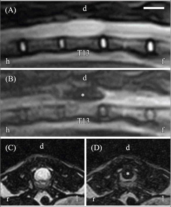 Fig. 2. Magnetic resonance imaging (MRI) of the thoracolumbar spinal cord on day 1. (A) Sagittal T2-weighted imaging (T2WI) reveals hyperintensity within the spinal cord. (B) Sagittal fluid-attenuated inversion recovery (FLAIR) imaging displays hypointensity at the same site (asterisk). (C) Transverse T2WI at the T13 level reveals hyperintensity involving nearly the entire spinal cord. (D) Transverse FLAIR imaging at the T13 level shows hypointensity in the same region, consistent with a fluid-filled lesion. However, it was not possible to determine whether the lesion was intramedullary or intradural-extramedullary because its signal characteristics were indistinguishable from the subarachnoid space. Orientation markers: h=head, f=foot, r=right, l=left. Scale bar=1 cm. CT myelography was performed using an Alexion CT scanner (Canon Medical Systems, Otawara, Japan) to evaluate the relationship of the fluid-filled lesion (slice thickness, 1.0 mm; reconstruction kernel, FC30). Iohexol (Omnipaque 240) was administered via lumbar puncture at a dose of 0.4 ml/kg under CT guidance. Scans were obtained approximately 5 minutes after the injection. The contrast distribution and the presence or absence of extradural/intradural filling defects were assessed. A bone tissue window (window width, 3,000 HU; window level, 500 HU) was used for analysis. CT revealed thickening of the dorsal vertebral arch associated with the T13 fracture, but no vertebral misalignment. CT myelography showed no narrowing or rupture of the contrast medium column (Fig. 3A–C), suggesting an intramedullary lesion.