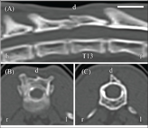 Fig. 3. CT myelography of the thoracolumbar vertebrae on day 1. (A) Sagittal reconstructed CT myelography shows no obvious spinal cord compression. (B) Transverse image at the T12–T13 level shows an intact contrast medium column without deformation. (C) Transverse image at the T13 level shows an expanded contrast medium column. Images were acquired using a bone tissue window (window width, 3,000 HU; window level, 500 HU). Orientation markers: h=head, f=foot, r=right, l=left. Scale bar=1 cm. Based on the diagnostic imaging findings, the cat was diagnosed with focal SHM. To the best of our knowledge, there are no published reports on the medical treatment of SHM in cats. Drawing from experience in dogs with syringomyelia associated with Chiari-like malformation, oral isosorbide (70% Isobide Syrup; Kowa, Tokyo, Japan) was empirically administered at 1 ml/kg twice daily until re-evaluation. On day 47, no adverse effects were noted in the cat’s general condition, complete blood count, or biochemical tests. However, ataxia persisted without obvious improvement or deterioration. Neurological examination again revealed loss of postural responses and decreased sensation of superficial pain in the pelvic limbs, along with tenderness in the lumbar spine. The MFS of the cat remained at grade 4. Follow-up MRI showed no significant change in the fluid-filled lesion, and surgery was performed due to the lack of improvement. T12–T13 dorsal laminectomy for spinal cord decompression and fluid drainage was performed under a standard anesthetic protocol. For the T12–T13 dorsal laminectomy, the cat was positioned prone, and the spinous processes of T12–L1 were exposed. The T13 spinous process was resected, and a dorsal laminectomy was performed. Upon entering the spinal canal, CSF-like fluid leakage was observed even before the dural incision. The laminectomy was extended caudally to include the spinous processes of T12–T13, followed by a dural incision. No obvious adhesions or dilation of the spinal arachnoid membrane was identified. The incision was closed without dural reattachment because no residual spinal cord compression remained. The procedure was completed without significant intraoperative complications. The cat received fentanyl citrate (1–3 μg/kg/hour) via continuous-rate infusion for analgesia postoperatively. Postoperative MRI confirmed resolution of the fluid-filled lesion, although detailed assessment of the spinal cord was limited by air artifacts. The cat recovered uneventfully and was discharged 2 days later. Postoperative monitoring revealed no signs of pain, such as vocalization or abnormal posture. Neurological deficits, including pelvic limb ataxia and proprioceptive loss, remained unchanged at the time of discharge; however, the general condition and appetite of the cat had improved. Oral cephalexin (Rilexipet A; Virbac, Carros, France) was administered at 25 mg/kg twice daily and prednisolone (Predonine; Shionogi, Osaka, Japan) at 0.3 mg/kg once daily for 2 weeks postoperatively. Postoperative rehabilitation was not feasible because of the temperament of the cat. On day 91, follow-up neurological examination revealed no change in gait or postural responses of the pelvic limbs; however, superficial pain sensation had returned, and lumbar tenderness was no longer present. The MFS of the cat remained at grade 4. MRI showed hyperintensity of the T13 spinal cord on T2WI and a slit-shaped signal void on FLAIR imaging. By day 188, the cat demonstrated improved mobility, including the ability to walk with mild ataxia and jump onto a table. Neurological examination revealed loss of postural responses, and the MFS remained at grade 4. MRI findings were unchanged, showing mild hyperintensity on T2WI and a slit-shaped hypointensity on FLAIR imaging (Fig. 4A–D).