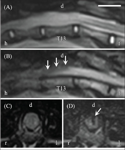 AbstractBackground: Diseases characterized by impaired spinal cord function due to fluid accumulation include syringohydromyelia (SHM) and spinal arachnoid diverticulum (SAD). SHM refers to fluid-filled cavities within the spinal cord, whereas SAD involves fluid accumulation in the subarachnoid space. Although the true incidence of SHM and SAD in cats is unknown, both conditions are rare based on the limited number of published case reports. Computed tomography (CT) myelography and magnetic resonance imaging (MRI) are regarded as the diagnostic gold standards. Case Description: An approximately 1-year-old female Japanese domestic shorthair was referred for pelvic limb paresis. 4 months before presentation, CT myelography had revealed a teardrop sign suggestive of SAD. Subsequent MRI and CT myelography identified focal SHM at T13. T12–T13 dorsal laminectomy was performed, during which cerebrospinal fluid (CSF)-like leakage was observed. Durotomy was also performed, but no abnormalities were detected in the spinal arachnoid membrane. 5 months postoperatively, the cat regained ambulatory function, although mild residual ataxia persisted. Follow-up MRI revealed a T2-hyperintense region and a slit-like signal void on fluid-attenuated inversion recovery at T13. Conclusion: This case demonstrates how the combination of MRI and CT myelography can effectively capture temporal changes in fluid accumulation within the spinal cord. Accurate imaging is essential for accurate diagnosis and treatment planning. Restoration of CSF perfusion and fluid drainage may contribute to clinical improvement in cats with focal SHM. Keywords: Cat, CT myelography, MRI, Spinal arachnoid diverticulum, Syringohydromyelia. IntroductionDiseases characterized by impaired spinal cord function due to fluid accumulation include syringohydromyelia (SHM) and spinal arachnoid diverticulum (SAD). SHM is defined by the formation of fluid-filled cavities within the spinal cord (Rusbridge et al., 2000; Rusbridge et al., 2006). More specifically, syringomyelia refers to a syrinx located within the spinal cord parenchyma, whereas hydromyelia denotes dilation of the central canal. However, because definitive premortem differentiation between the two is difficult, the umbrella term SHM is commonly used regardless of syrinx location (Milhorat et al., 1995; Rusbridge et al., 2000). By contrast, SAD involves focal cerebrospinal fluid (CSF) accumulation within the subarachnoid space, leading to spinal cord compression and clinical signs of myelopathy (da Costa and Cook, 2016). Historically called spinal arachnoid cysts, the term SAD is now preferred because these lesions lack the epithelial lining characteristic of true cysts (Lowrie et al., 2014). The clinical signs of these conditions reflect the location of the myelopathy and are typically characterized by proprioceptive ataxia with varying degrees of tetraparesis or paraparesis, often accompanied by spinal-associated hyperpathia. Both SHM and SAD are rarely reported in dogs and are even less common in cats. To the best of our knowledge, reports of SHM and SAD in cats remain limited to isolated case reports and small case series, underscoring their rarity in the veterinary literature. Advanced imaging modalities, such as computed tomography (CT) myelography, and magnetic resonance imaging (MRI), are considered the gold standard for evaluating these diseases. On CT myelography, SAD appears as a teardrop-shaped expansion of the subarachnoid space filled with contrast medium, whereas SHM, which represents fluid retention within the spinal cord, is poorly visualized. Conversely, MRI is highly effective in detecting SHM but may be less reliable in assessing its continuity with the subarachnoid space. In this case, combining the two modalities allowed the initial identification of SAD and subsequent evaluation of SHM, clarifying the sequential transition between these conditions. This case report describes a rare presentation in which SAD and SHM developed at different times in the spinal cord of a cat, with both MRI and CT myelography aiding in their distinction. The findings emphasize the clinical relevance of combining imaging modalities to capture temporal changes in fluid accumulation and to guide appropriate treatment strategies in feline spinal myelopathy. Case DetailsAn approximately 7-month-old female Japanese domestic shorthair was referred to Matsuno Pet Clinic with paresis of both pelvic limbs and a history of back trauma since adoption. The cat had previously been treated with antibiotics for trauma, but pelvic limb paresis persisted. Approximately 1 month later (day −118), CT myelography was performed at Akita Komatsu Animal Hospital using a Brivo CT 385 scanner (GE Healthcare, Chicago, IL, USA) (slice thickness, 1.25 mm; reconstruction kernel, BONEPLUS). Iohexol (Omnipaque 240, 240 mg I/ml; GE Healthcare) was administered via lumbar puncture at a dose of 0.5 ml/kg under the guidance of C-arm fluoroscopy (Brivo OEC 785; GE Healthcare). Scans were obtained approximately 5 minutes after the injection. Contrast distribution and the presence or absence of extradural/intradural filling defects were assessed. A bone tissue window (window width, 3000 HU; window level, 500 HU) was used for analysis. These studies revealed spinal cord compression caused by a T13 vertebra fracture and a “teardrop sign” in the contrast column at the same site (Fig. 1A–C). Although no obvious fracture line was observed in T12, spinal cord compression due to dorsal lamina thickening was noted.