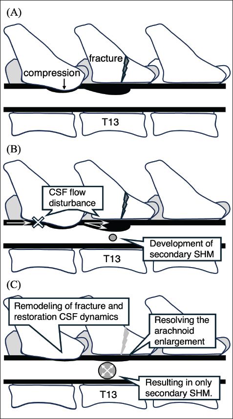 Fig. 5. Schematic diagram illustrating the proposed mechanism of secondary syringohydromyelia (SHM) formation in this case. (A) Four months prior, trauma-related injury or thickening of T12 caused a cerebrospinal fluid (CSF) perfusion disorder, leading to the formation of a spinal arachnoid diverticulum (SAD). (B) The resulting CSF flow disturbance contributed to the development of secondary SHM. (C) As the vertebral fracture healed and CSF flow dynamics were restored, the arachnoid expansion resolved, leaving only the secondary SHM. The cat underwent surgery to alleviate clinical symptoms by draining the intraspinal fluid and preventing re-accumulation through the restoration of CSF perfusion via laminectomy. During the procedure, fluid leakage was observed upon dorsal lamina resection. This leakage was interpreted as a rupture of the dura mater and dorsal spinal cord surface, possibly caused by elevated intraspinal pressure, spinal cord thinning, and minor mechanical stimulation. In humans, the treatment of symptomatic SHM associated with SAD generally focuses on addressing the underlying filling mechanism of the SAD (Mallucci et al., 1997; Srinivasan et al., 2016). However, in the present case, it was not possible to determine whether CSF flow dynamics were restored postoperatively. Advanced imaging techniques capable of visualizing CSF flow, such as the time-spatial labeling inversion pulse method with high-field MRI (Ito et al., 2021; Ishikawa et al., 2024), may be useful for evaluating CSF dynamics in similar cases. If no abnormalities in CSF flow are detected, less invasive approaches, such as percutaneous fluid drainage by lumbar puncture, could be considered as alternatives to surgical interventions that impose additional stress on the compromised spinal cord. In this case, clinical improvement suggested that fluid drainage was beneficial; however, treatment options that minimize spinal cord invasiveness warrant consideration. Further evaluation of the consequences of spinal cord rupture, including long-term prognosis, is required. This case report has several limitations. First, histopathological confirmation was not obtained, precluding a definitive diagnosis of the observed lesions. In future cases, tissue sampling, such as during postmortem examination, may help validate imaging findings and improve diagnostic accuracy. Second, low-field MRI was used, which may have limited spatial resolution and contrast differentiation, particularly in regions with extensive fluid accumulation. Detailed localization of fluid retention was achieved using high-spatial resolution CT myelography. However, the use of high-field MRI or advanced imaging techniques, such as contrast-enhanced MR myelography, could provide a more precise evaluation of CSF dynamics and a clearer delineation of intradural structures, thereby enhancing our understanding of the underlying pathophysiology. Additionally, differences in CT myelography techniques between facilities could potentially influence image appearance; however, given the inherently high spatial resolution of CT myelography, such differences would not be expected to alter intramedullary versus extramedullary localization. Finally, because this is a single case report, the ability to generalize the findings is limited. Nonetheless, the rarity and unusual clinical course described in this case report provide valuable insights for clinicians and underscore the importance of combining multiple imaging modalities, such as MRI and CT myelography, particularly when a single modality is insufficient for accurate lesion localization. ConclusionMyelopathy caused by fluid accumulation within the spinal cord is an uncommon condition in cats, and this case demonstrated a unique temporal shift in the location of fluid retention. Accurate diagnosis through a combination of MRI and CT myelography is essential because the distribution of fluid provides important clues for classifying the pathology and selecting appropriate treatment strategies. In suspected cases, early CT myelography may help identify abnormalities in the subarachnoid space that are not visible on MRI alone. Moreover, even when clinical signs improve, follow-up imaging is recommended to monitor the potential development of secondary SHM. Although no established treatment protocol exists for focal SHM in cats, prioritizing fluid drainage and the restoration of CSF perfusion may lead to clinical improvement. This case contributes to a broader understanding of feline myelopathy and CSF dynamics. Further studies involving larger case numbers and advanced imaging modalities, such as contrast-enhanced MR myelography, are needed to clarify the underlying pathophysiology and refine diagnostic and therapeutic approaches. AcknowledgmentsNone. Conflicts of interestThe authors have no conflicts of interest related to this work. FundingThis study received no specific grant. Authors’ contributionKN: case management, imaging acquisition/interpretation, surgery, conceptualization, writing—original draft. MM: perioperative and postoperative care. MK: imaging acquisition and interpretation. TN, YH, and MK: writing—review and editing. Data availabilityThe imaging DICOM files supporting the findings of this study are available from the corresponding author upon reasonable request. Clinical data have been included within the article, and all personal or owner-identifying information has been removed. ReferencesChen, A.V., Bagley, R.S., West, C.L., Gavin, P.R. and Tucker, R.L. 2005. Fecal incontinence and spinal cord abnormalities in seven dogs. J. Am. Vet. Med. Assoc. 227, 1945–1951; doi:10.2460/javma.2005.227.1945 Crawford, A.H., Stoll, A.L., Sanchez-Masian, D., Shea, A., Michaels, J., Fraser, A.R. and Beltran, E. 2017. Clinicopathologic Features and Magnetic Resonance Imaging Findings in 24 Cats With Histopathologically Confirmed Neurologic Feline Infectious Peritonitis. J. Vet. Intern. Med. 31, 1477–1486; d