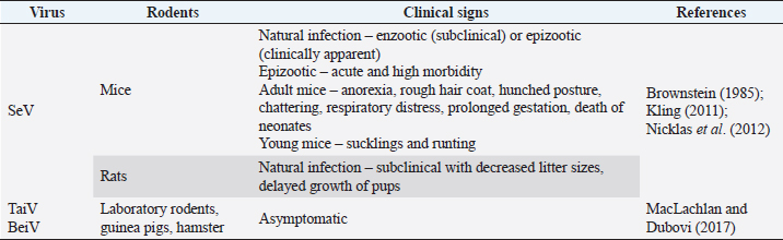 Fig. 2. Pathogenesis of SeV infection in rodents. Clinical manifestationsThe SeV also known as murine parainfluenza virus-1 has been associated with respiratory sickness in laboratory mice, rats, hamsters, and in guinea pigs (Barthold et al., 2016). Table 2 summarizes the clinical signs of paramyxovirus infection in rodents. Animals like other rodents (guinea pigs, beavers, squirrels, etc.), and lagomorphs (rabbits, etc.) are frequently infected with viruses that are mild or asymptomatic (MacLachlan et al., 2011). Cytotoxic T lymphocytes assault virus-infected cells during infection at the "immune" phase, resulting in lesions in respiratory tracts including necrotizing rhinitis, tracheitis, bronchiolitis, and interstitial pneumonia, among other manifestations. Clinical indications manifest themselves in completely immunocompetent animals, with various degrees of morbidity and death according to the age, strain, and immunocompetence of the animals involved. Instead of pathognomonic immune-mediated necrotizing bronchiolitis, nude mice develop long-term progressive interstitial pneumonia, a type of chronic lung infection (Ward et al., 1976). Furthermore, rats infected by SeV produce fewer litter sizes and poor pup development (Kling, 2011). Enzootic infection in rats can manifest itself in two distinct ways: as enzootic (subclinical) infection or as epizootic (clinical) as discussed by Nicklas et al. (2012). The development of latent infection follows an enzootic pattern. Mice in breeding colonies obtain infection promptly after weaning due to low levels of antibodies in the maternal serum after birth. The pattern of the epidemic, on the other hand, is often acute, contributing to increased morbidity and mortality, with almost all susceptible animals getting infected within a short period of time. Between 2 and 7 months after the virus is initially introduced to a colony, sick animals might die or become sub-clinically infected. Diagnostic Methods of Paramyxoviruses InfectionSerological diagnosisSeV infection in rats is best diagnosed by Indirect Enzyme-Linked Immunosorbent Assay (ELISA) or Multiplexed Fluorometric ImmunoAssay due to their sensitivity to detect the early and low antibody titers (Kling, 2011). Rothenburger et al. (2015) used an ELISA with minimal alterations to detect respiratory infections in rats. Serum samples from 139 rats were tested for the bovine respiratory syncytial virus, a pneumovirus related to murine pneumonia virus, and the bovine parainfluenza virus 3, a virus related to the SeV. The results revealed that lysed Vero cells infected with these isolates generated partially purified antigens, with lysed uninfected Vero cells acting as a positive control. No evidences for the rat coronavirus, SeV or murine pneumonia virus were found. However, the negative finding is possibly due to the small sample size employed in the testing. In laboratory rodent colony settling, ELISA and immunofluorescence techniques are most commonly used (MacLachlan and Dubovi, 2017). Antibodies can be detected 7 days after infection, and their presence is often linked to the beginning of immune-mediated necrotizing bronchiolitis and pneumonia. The presence of the virus is further confirmed by the immunofluorescence or immunohistochemical staining of infected monolayers in the embryonated eggs or a variety of cell culture methods including monkey kidney, Vero, and BHK-21 cells with trypsin in the culture conditions. Table 2. Clinical signs of paramyxoviruses infection in rodents.