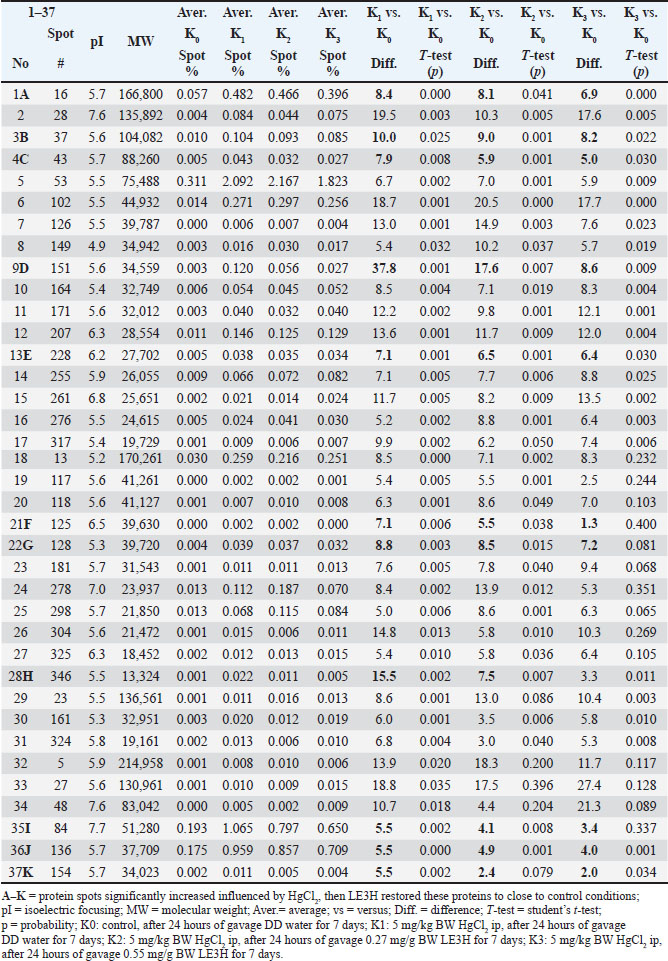 Fig. 2. The reference gel shows all spot numbers. All spot data, including pI and MW, can be found in Tables 2 and 3. Statistical analysisProtein spot intensity K0 (control, after 24 hours gavage DD water for 7 days), K1 (5 mg/kg BW HgCl2 ip, after 24 hours gavage DD water for 7 days), K2 (5 mg/kg BW HgCl2 ip, after 24 hours gavage 0.27 mg/g BW LE3H for 7 days), and K3 (5 mg/kg BW HgCl2 ip, after 24 hours gavage 0.55 mg/g BW LE3H for 7 days) (Table 1) are the main studies in this toxicoproteomics research. There are three types of protein spot intensity comparisons: (a) K1 versus K0 (K1/K0), (b) K2 versus K0 (K2/K0), and (c) K3 versus K0 (K3/K0 (Tables 2–4). Example for protein spot code D: K1/K0=37.8, K2/K0=17.6, and K3/K0=8.6 (Table 5). Example for Protein Spot code L: K1/K0=−8.4, K2/K0=−6.3, K3/K0=−5.6 (Table 6). The results of this study were extrapolated through several comparisons, leading to the determination of the least significant difference (Tables 2, 3, and 4) (Steel and Torrie, 1981). Table 2. Summary of results for 2D gel comparison of K1, K2, and K3 vs. K0. Reference spot numbering (1-37), pI, and MW are given for changing polypeptide spots analyzed in samples K1 (LF1404 #7-8), K2 (LF1404 #9-10), K3 (LF1404 #11, LF1406 #3), and K0 (LF1404 #5-6). Also shown are fold increases or decreases (difference) of the polypeptides for K1, K2, and K3 vs. K0.