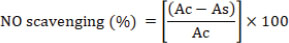 where Ac: absorbance of the control, Ab: absorbance of the blank, and As: absorbance of the sample. A lower absorbance indicated higher DPPH radical-scavenging activity. The experiments were performed in triplicate (Zourgui et al., 2020; Ben Lataief et al., 2021). Nitric oxide (NO) radical-scavenging assayThe NO scavenging activity was evaluated using the method described by Jagetia and Baliga (2004). Under aerobic conditions, NO was generated from sodium nitroprusside (10 mM in 0.5 M phosphate buffer, pH 7.4), and the nitrate ion concentration was determined using Griess reagent. Briefly, 250 µl of each sample at varying concentrations was mixed with 250 µl of sodium nitroprusside and incubated at 25°C for 140 minutes. Subsequently, 150 µl of Griess reagent (1% sulfanilamide, 1% N-(1-naphthyl) ethylene diamine dihydrochloride, and 2.5% phosphoric acid) was added to 150 µl of the incubated mixture. After 30 minutes, the absorbance was measured at 546 nm, and the NO scavenging activity was calculated using the following formula: