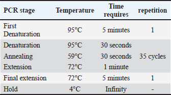 ABSTRACTBackground: Trypanosoma evansi is a protozoan parasite that causes trypanosomiasis, referred to as ‟surra.” It affects a wide variety of both wild and domesticated species on many continents. The primary host species differ geographically; however, camelids, equine, buffalo, and farm animals are at risk of infection. In vector-borne sickness, numerous species of blood-consuming flies, along with Tabanids and Stomoxys, are involved in transporting pathogens from one animal to another, acting as mechanical vectors. Aim: This study was established to evaluate the prevalence of T. evansi in sheep in Baghdad and investigate the impact of age and sex on the infection rate. Methods: A total of 200 blood samples were obtained from October 2023 to March 2024. These samples were examined using Giemsa stain under a light microscope, and 40 positive samples were selected for further investigation using conventional polymerase chain reaction (PCR). Results: The results showed an infection rate of 20%, with significant differences observed between male and female sheep. Younger sheep were found to be significantly more affected than older ones. Ten PCR-detected samples were randomly selected for DNA molecular analysis to obtain ITS-1 gene nucleotide sequences. The PCR product exhibited a band size of 1,264 bp, and the sequences were deposited in the National Center for Biotechnology Information under the following code numbers: PP930358.1, PP930353.1, PP930350.1, PP930357.1, PP930356.1, PP930351.1, PP930359.1, PP930352.1, PP930354.1, and PP930355.1. Conclusion: The current study results indicate that T. evansi occurs and circulates in sheep and confirm that the molecular approach for detecting DNA of Trypanosoma species by the use of ITS1 makes it a highly dependable assay for species recognition of this parasite. Keywords: Trypanosomiasis, Surra, Stable fly, Ovine, PCR. IntroductionTrypanosoma evansi is a protozoan salivarian parasite, classified under the Trypanosomatidae family, and the causative agent of surra disease, also known as trypanosomiasis, in vertebrate animals. Trypanosoma evansi parasitizes a wide range of both wild and domestic animals, such as sheep, horses, camels, cattle, and numerous wildlife animals. The transmission of T. evansi appears to be mechanical and facilitated by stable insects of the genus Stomoxys and horseflies of the species Tabanus (Rjeibi et al., 2015); however, infected animal blood can also be a source of infection through wound contamination (Desquesnes et al., 2013). The pathogenicity of trypanosomiasis depends on many factors, including factors that are related to the parasite, such as the virulence of the strain, and other factors related to the host (nutritional situation, immunity, species, age), and other environmental factors. Severe clinical manifestations of trypanosomiasis, fever, and anemia, combined with other systemic conditions, can lead to death through congestive heart failure. Lymph nodes, along with spleen enlargement, weight loss, pyrexia, ataxia, lethargy, and dropping in animals’ production (Taylor and Authié, 2004), have been associated with many degenerative inflammatory effects, leading to damage to many systems, such as the pituitary gland, eyes, gonads, and central nervous system (Van den Bossche and Delespaux, 2011; Ahmed et al., 2020). Many diagnostic methods, such as microscopic examination of different blood smears and serological and molecular assays, can be performed for blood parasites (Fadhil et al., 2021; Abed et al., 2023). Although blood detection techniques, such as direct smear or serological assays, have been used for many years for T. evansi diagnosis, they have shown low sensitivity in detecting and differentiating various Trypanosoma species in different animals. Thus, molecular assays have been used to overcome the limitations of these methods (Al-Fatlawi and Al-Fatlawi, 2019; Barghash, 2020; Mamman et al., 2021) and improve the diagnosis of the disease in many infections (Sivajothi et al., 2016; Mulenga et al., 2021). Additionally, it was found that polymerase chain reaction (PCR) showed more sensitivity and specificity and was able to detect T. evansi at tiny levels (Desquesnes et al., 2022). Our study was conducted to characterize Trypanosoma in sheep in Baghdad city because of data limitations. Materials and MethodsEthical approvalThe project was approved by the official committee of the College of Veterinary Medicine for Animal Care at the University of Baghdad (approval number: 569). Blood samplesThe time frame for blood sample collection is from the beginning of October 2023 to the end of March 2024. A total of 200 direct blood samples were taken directly from the jugular vein of sheep of various ages and sexes. Anticoagulant ethylene diamine-tetraacetic acid tubes were used to overcome blood coagulation. All samples were preserved and transferred to the Laboratory of the College of Veterinary Medicine, University of Baghdad. All samples were examined under a microscope, and blood smears were stained with Giemsa (Faraj et al., 2019; Abdullah and Ali, 2021). Identified samples were kept at −20°C for further PCR assay. Blood genomic DNA extractionTrypanosoma DNA was extracted from Giemsa-identified samples using the gSYAN DNA mini extraction kit (Frozen Blood) from Geneaid company, USA. The extraction procedure followed the manufacturer’s recommendations. Genomic DNA purity estimationThe genomic DNA extracted was estimated using a Nanodrop (Thermo, USA). The DNA concentration was between 5 and 50 ng/μl, and the absorbance at 260 and 280 nm was used to measure the DNA purity. Polymerase chain reactionFor the detection of Trypanosoma spp., a conventional PCR assay was used using ITS1 gene couple primers, as forward primers: 5’ GGTGATCGGACCGTCGCTCGTCT - 3’ and reverse primer: 5’ CCTCTTCGCTCGCCGCTGACTG - 3’with a PCR product size (1,264 bp) from sheep blood extracted DNA samples (Khuchare
