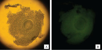 Fig. 5. Cytochrome c expression in oocytes by immunofluorescence with FITC marker Normal (A) and fluorescence (B) light.