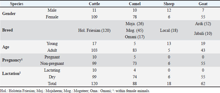 Ethical approvalThis study was conducted in accordance with the principles of the Declaration of Helsinki. The Ethics Committee of King Faisal University, Saudi Arabia, approved this study (KFU-REC-2025-MAR- ETHICS3208). ResultsA total of 288 serum samples were collected from 120 cattle, 88 camels, 18 sheep, and 62 goats kept on different farms in the Al-Ahsa Region in the Eastern Province of Saudi Arabia. The samples were evaluated for the presence of antibodies against the gram-negative bacterium H. pylori. For all species, 16 samples were positive for H. pylori with an overall prevalence of 5.6%, 24 samples (8.3%) were considered borderline, and 248 samples (86.1%) were negative (Table 2). The highest seroprevalence was found within the cattle population, with 12 positive and 18 borderline samples corresponding to 10% seropositivity and 15% borderline positivity, respectively (Table 2). All the positive and borderline cattle were female except for one male. All positive and borderline cattle were adult animals, except for one young animal. The borderline female animals included three lactating and 14 non-lactating cows, and two pregnant and 15 non-pregnant cows. The seropositive female animals included six lactating and six non-lactating cows and one pregnant and 11 non-pregnant cows (Table 3). Among the tested goat samples, two samples were positive for H. pylori antibodies (3.2%) and two were borderline positive (3.2%). All positive goats were female animals of the Ardi breed, including two positive adults and two borderline young goats. All tested sheep samples were negative for H. pylori antibodies. Within the camel population, two animals were found positive (one of the Mogateer and one of the Mojaheem breed), and four animals (two of the Mojaheem and two of the Omani breed) were found borderline for H. pylori antibodies, representing a seropositivity of 2.2% and borderline positivity of 4.5%, respectively. The positive animals (positive and borderline) included five females (all non-lactating and one pregnant) and one male camel. All the camels were adult animals, except for one young animal. DiscussionThe gram-negative spiral bacterium H. pylori is the causative agent of stomach ulcers in humans (Shaaban et al., 2023). Although the exact route of infection remains unknown, transmission through the oral-oral or fecal-oral routes has been proposed (Duan et al., 2023; Costa et al., 2024). The zoonotic potential of H. pylori has been reported in different studies (Rahimi and Kheirabadi, 2012; Mladenova-Hristova et al., 2017; Guessoum et al., 2018). Although a high prevalence of H. pylori was reported in humans from Saudi Arabia, studies on the role of local animals in disease transmission to humans are still limited. Therefore, the present study was conducted to test the presence of anti-H. pylori antibodies in serum samples collected from different animal species in the Eastern Region of Saudi Arabia. The assumption of a zoonotic potential of H. pylori first came from epidemiological studies reporting the higher prevalence of H. pylori infection in professionals involved in animal handling or dealing with animal products, such as abattoir and meat professionals (Morris et al., 1986; Vaira et al., 1988). Subsequently, several studies were conducted in different countries and geographical areas of the world on the presence of H. pylori in animals with different prevalence results related to animal species and other factors (Dore et al., 2001; Turutoglu and Mudul, 2002; Rahimi and Kheirabadi, 2012; Mladenova-Hristova et al., 2017; Elhariri et al.et al., 2018; Guessoum et al.et al., 2018; ). The results of the present study are in line with those of previous studies reporting a higher prevalence of H. pylori in cows than in other ruminants (Elhariri et al., 2018). Similarly, Talaei et al. (2015) reported a higher prevalence of H. pylori in cattle (16%) than in sheep (13.7%), goats (4.7%), and camel (13.3%) (Talaei et al., 2015). Table 2. Prevalence of H. pylori antibodies in serum samples from cattle, camels, sheep, and goats from the Al-Ahsa Region in the Eastern Province of Saudi Arabia.