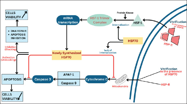Fig. 4. HSP70 protection mechanism in vitrified oocytes through HSP70 cell signaling by blocking cytochrome c and caspase 3 to inhibit apoptosis Figure 4 shows the molecular regulatory pathway of HSP70 in maintaining cell viability through inhibition of vitrification-induced apoptosis, especially in sensitive cells such as oocytes or embryos. During stress processes, such as vitrification, activation of heat shock factor 1 (HSF-1) occurs through phosphorylation by protein kinases, which causes trimerization of HSF-1 and its translocation to the nucleus to induce transcription of HSP70 mRNA (Jin et al., 2018). The newly synthesized HSP70 protein then enters the cytoplasm and functions as a molecular chaperone (Mayer and Bukau, 2005). HSP70 plays a crucial role in inhibiting the release of cytochrome C from mitochondria, thereby preventing the activation of the intrinsic apoptosis pathway, thereby inhibiting the formation of the apoptosome complex (APAF-1–Caspase 9) and the activation of Caspase 3, thereby blocking the apoptosis cascade, supporting DNA repair, and inhibiting cell death signals, which overall increases cell viability (Beere et al., 2000). However, if HSP70 is not available or is not successfully internalized, vitrification stress can lead to cytochrome C release, caspase activation, and ultimately apoptosis, which is characterized by decreased cell viability (Mosser et al., 2000). Figure 4 also shows that the HSP response (HSP-R) is insufficient to prevent cell damage under vitrification conditions without HSP70, resulting in increased apoptosis. In contrast, vitrification in the presence of HSP70 produces an effective protective response and increases post-vitrification cell survival. The mechanism of oocyte protection during the vitrification process played by HSP70 is also a new finding in this study. HSP70 supplemented into cryoprotectants can interact with oocytes through the presence of HSP70 receptors (HSP70-R) in the zona pellucida and cause an intracellular reaction in the form of cell signaling (Spinaci et al., 2005). Extreme temperature changes as stressors during the vitrification process will cause HSF-1 in the cytosol to bind to groups with HSP that were originally inactive to become active. HSF-1 is separated from HSP70 (Stamperna et al., 2021). Protein kinase phosphorylates HSF-1 and trimerizes it in the cytosol. This HSF-1 trimer complex enters the cell nucleus and binds to the heat shock element (HSE) in the promoter region of the HSP70 gene (Prince et al., 2020). The HSP70 mRNA undergoes transcription and enters the cytoplasm to be synthesized and translated into new HSP70 (Horrell et al., 1987). This cell protection mechanism includes the function of HSPs as chaperone molecules that help the translocation process of proteins synthesized in cells and help the repair and refolding process of damaged proteins, as well as inhibit apoptosis. HSP70 shows a cell protection mechanism by preventing the activation of proapoptotic caspases (Ran et al., 2004). Nevertheless, several limitations should be acknowledged regarding HSP70 supplementation in vitrification protocols. Excessive exogenous HSP70 may disrupt endogenous chaperone networks, alter protein homeostasis, or even trigger unintended immunogenic responses, thereby compromising developmental competence. In addition, species-specific differences in membrane composition, receptor distribution, and intracellular signaling pathways may limit the generalizability of results obtained from model organisms. The lack of standardized dosing regimens further complicates reproducibility and hinders translation into clinical or field applications. Therefore, while HSP70 supplementation offers promising cytoprotective effects, its application should be carefully optimized and validated through comprehensive long-term safety assessments. ConclusionHSP70 plays a central role in protecting oocytes from vitrification-induced cellular stress. Numerous experimental evidence suggests that HSP70 functions as a molecular chaperone, not only preventing protein denaturation but also inhibiting the apoptotic pathway through mitochondrial stabilization, cytochrome c release suppression, apoptosome formation inhibition, and caspase-3 activation. Adequate HSP70 during vitrification can significantly increase oocyte viability and reduce the extent of structural and functional damage. However, recent studies have also highlighted that the protective effects of HSP70 are highly dependent on the biological context and expression level of HSP70. Studies in various species indicate that the optimal levels of HSP70 supplementation are not fully agreed upon, and excessive expression can disrupt important physiological processes, such as oocyte maturation, cell division, and subsequent embryonic development. Therefore, balancing the protective benefits and potential biological disruptions of HSP70 is crucial. Further research is needed to determine the dose-response curve, the most effective timing of supplementation, and differences in sensitivity between species and stages of oocyte development in the context of clinical applications or reproductive technology. AcknowledgmentsThe authors would like to thank the Faculty of Veterinary Medicine, Universitas Airlangga. The author also thanks Win Darmanto, Aucky Hinting, and Aulanni’am Aulanni’am for their expertise. Author’s contributionsRR, SPM, ARK, and WW: conceived the idea and drafted the manuscript. PS, SRA, IM, and AOA: acquired, analyzed, and interpreted the data. BPP, FAR, SW, BWKW, and ATK: critically read and revised the manuscript for intellectual content. All authors have read and approved the final version of the manuscript. All authors have read, reviewed, and approved the final version of the manuscript. Conflict of interestThe authors declare no conflict of interest. FundingThis study was funded by the authors. Data availabilityAll data are available in the revised manu