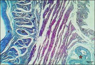 Fig. 11. Longitudinal section of esophagus-thoracic region (mature cat) shows (E) very thick epithelium, (asterisks) thin lamina propria, (black arrows) thin muscularis mucosa, (S) very thick loose connective tissue of submucosa, (red arrow) thick inner circular bundles of skeletal muscle of tunica muscularis. H&E stain.