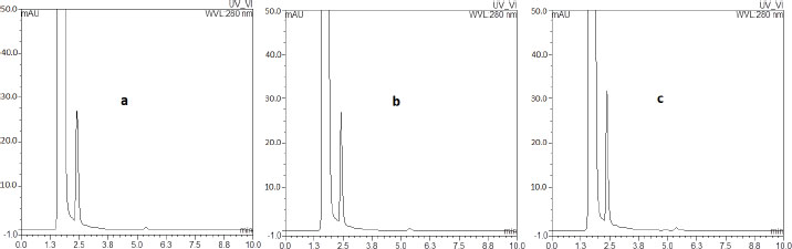 The selected wavelength of 280 nm was set upon inspection of the UV absorbance spectra for all analytes and the IS. Despite a slight difference in their maximum absorption, 280 nm provided a strong and consistent response for all targeted compounds without significant compromise in sensitivity or selectivity. The optimized chromatographic conditions achieved good resolution and symmetrical peaks for the analytes and IS, as well as a short run time of 10 minutes (Fig. 1) for the chromatogram of the highest level in CC spiked in a poultry blank. Table 2 summarizes the corresponding peak parameters.