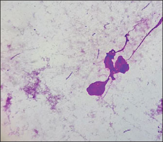 Fig. 2. Imprint smear of the gastric mucosa in a cat (moderate colonization density by helicobacter). Staining according to Romanowsky’s method. Original magnification ×900. Fecal samples were collected from privately owned cats presenting at the clinic for further investigation. Samples were obtained from 60 animals, of which 30 exhibited clinical signs of gastrointestinal diseases, and 30 showed no such signs. The age of the animals ranged from 1 to 12 years. Subsequently, species-specific and genus-specific amplifications were conducted using various primers (Figs. 3–6). The results are presented in Table 3.